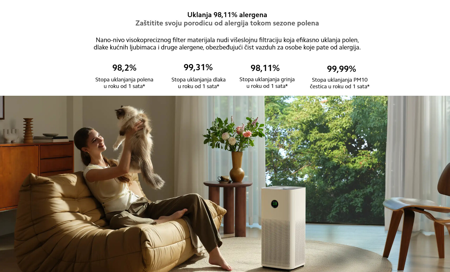 *98,2% brzina uklanjanja alergena polena za 1 sat: Podaci potiču od Cheari (Peking) Testing and Certification Co., Ltd. Broj izveštaja: WCk-25-51173.