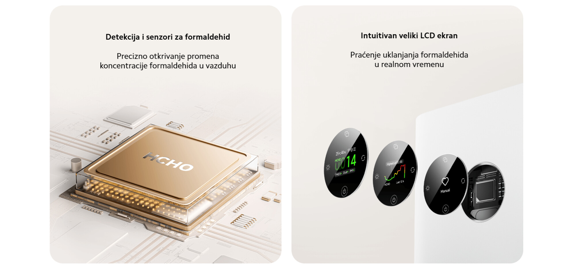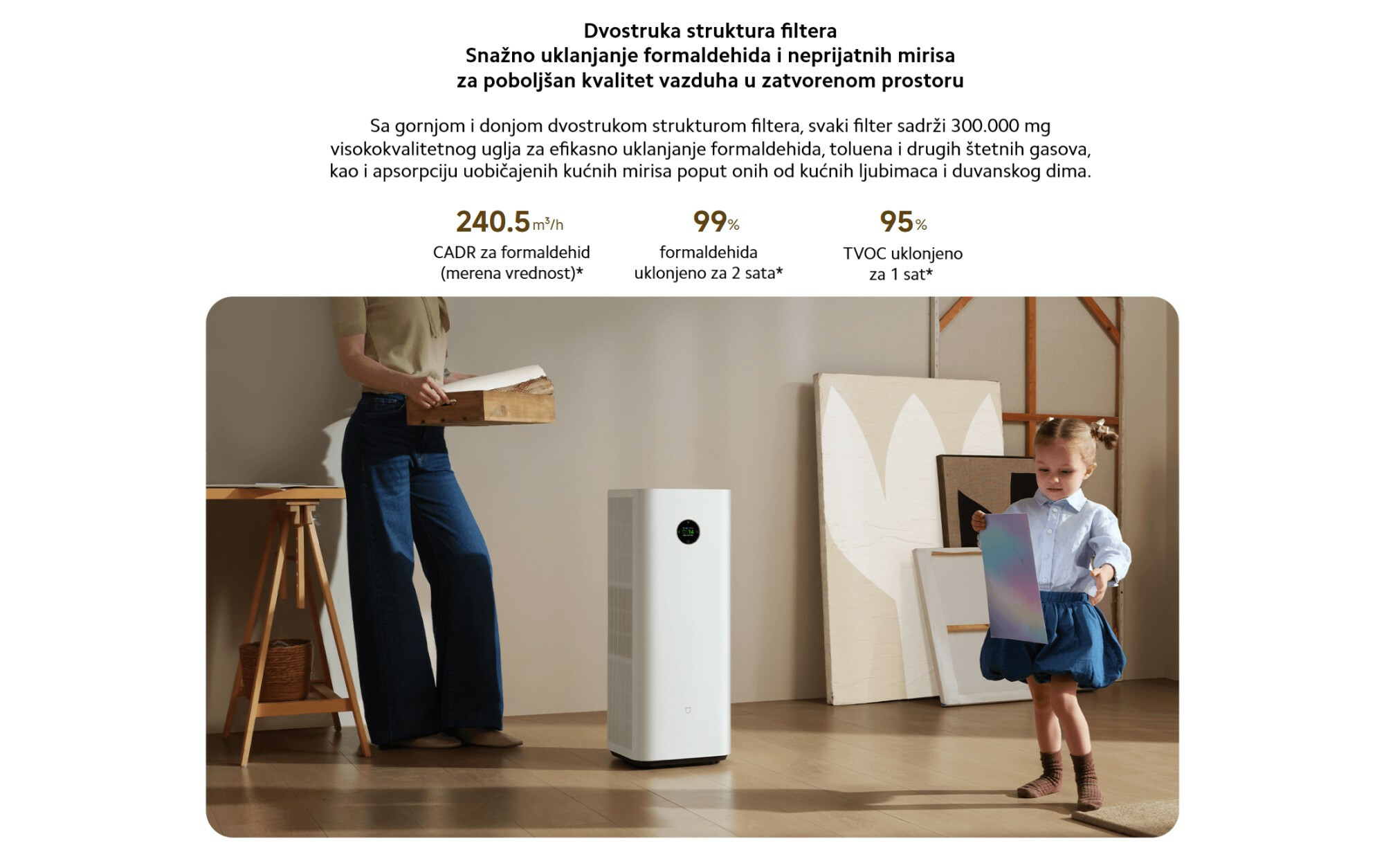 *240,5 m³/h formaldehid CADR (izmerena vrednost): Podaci potiču iz Nacionalnog centra za inspekciju kvaliteta i ispitivanje proizvoda za prečišćavanje vazduha kompanije Guangzhou Institute of Microbiologi Group Co., Ltd. Broj izveštaja: KJ2025003247E.