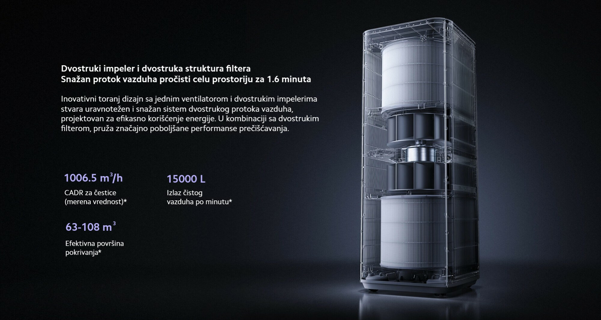*Preporučena površina pokrivenosti 63-108 m²: Izračunato prema uputstvu za prečišćivač vazduha (GB/T18801-2022), Dodatak F.4. Površina pokrivenosti = CADR čestica × (0,07–0,12).