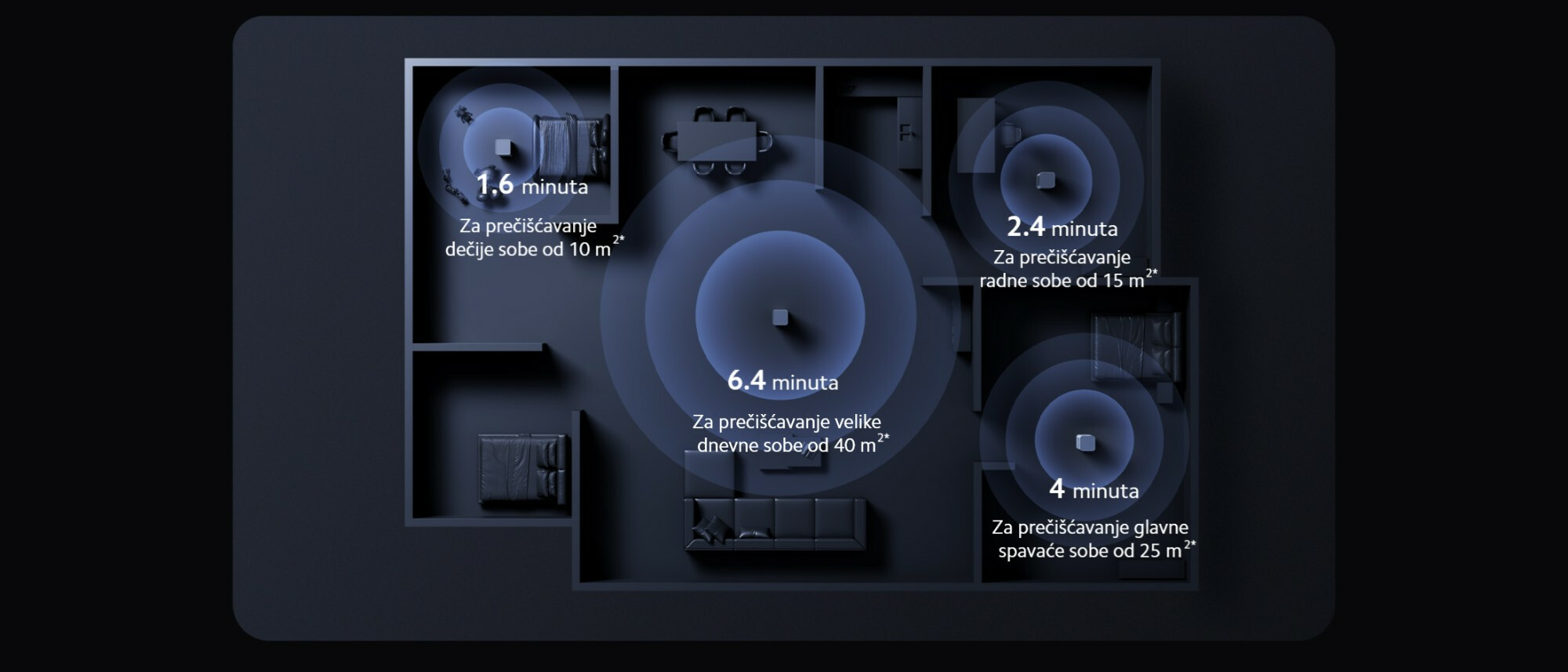*U prostoriji sa visinom plafona od 2,4 m, vreme za jednokratno prečišćavanje (min) = površina sobe × visina sobe × 60 / CADR čestica.