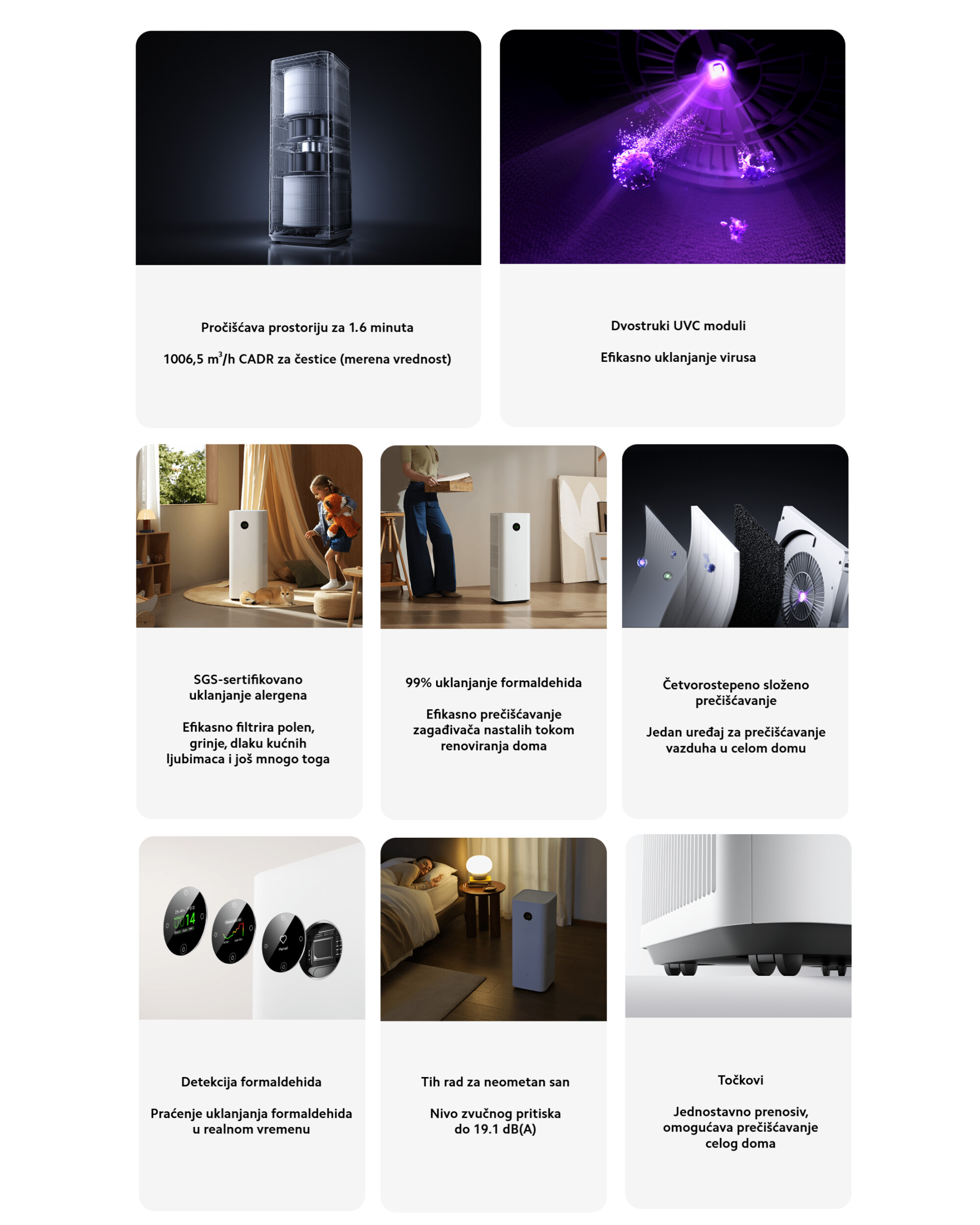 | Efikasnost prečišćavanja | 98.03% - 99.02% stopa uklanjanja alergena polena, grinja, dlaka kućnih ljubimaca; 99.99% stopa uklanjanja PM1, PM 2.5 i PM 10 čestica; 99.99% stopa uklanjanja H1N1 virusa; 99% stopa ukljanjanja formadehilda |