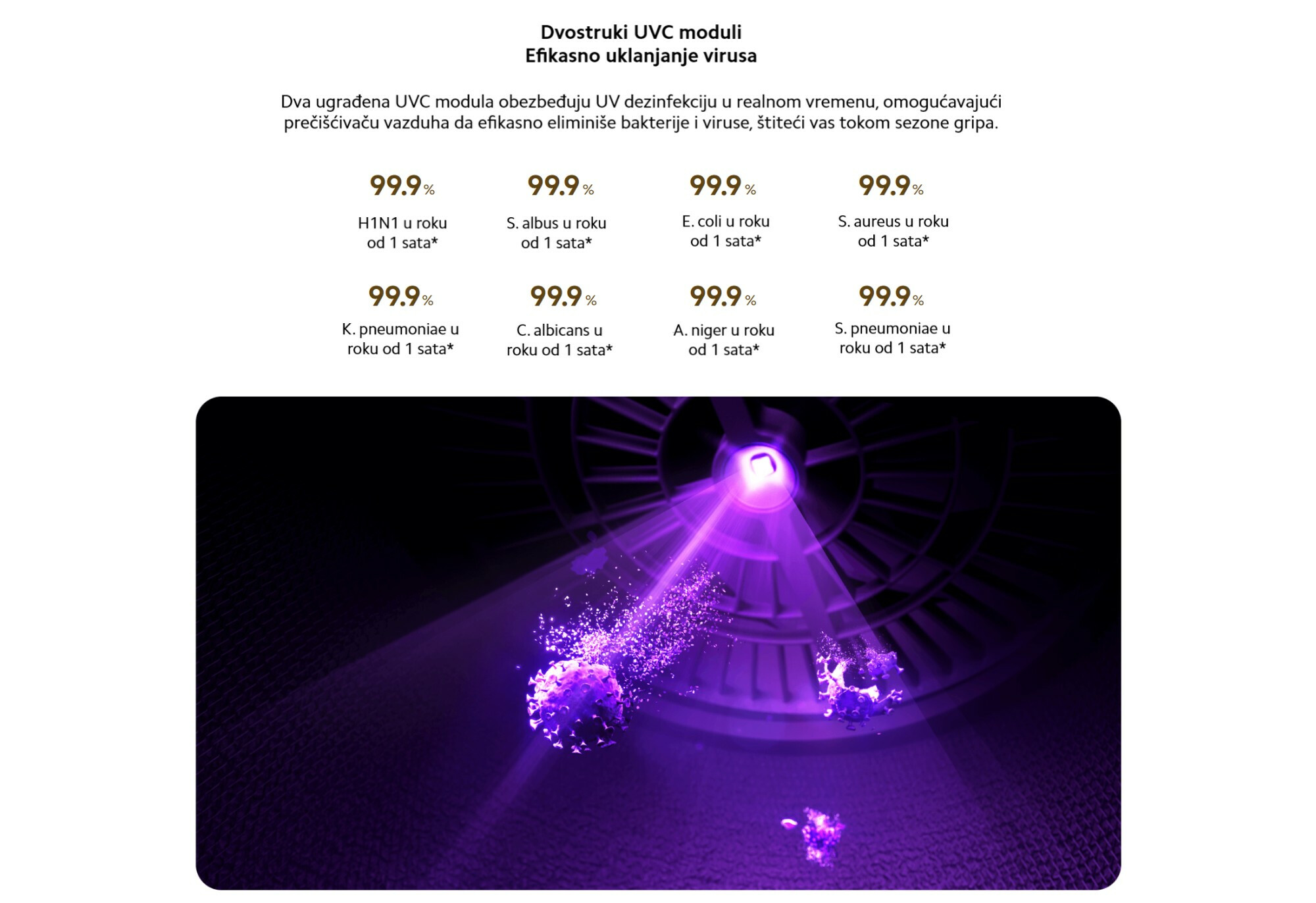 *99,9% S. pneumoniae uklonjeno za 1 sat: Podaci potiču iz Nacionalnog centra za inspekciju kvaliteta i ispitivanje proizvoda za prečišćavanje vazduha kompanije Guangzhou Institute of Microbiology Group Co., Ltd. Broj izveštaja: KJ2025002554E.