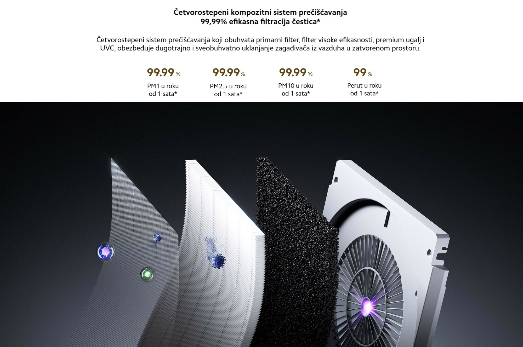 *99,99% visokoefikasne filtracije čestica: Označava stopu uklanjanja od 99,99% za PM1, PM2,5 i PM10 u roku od 1 sata.