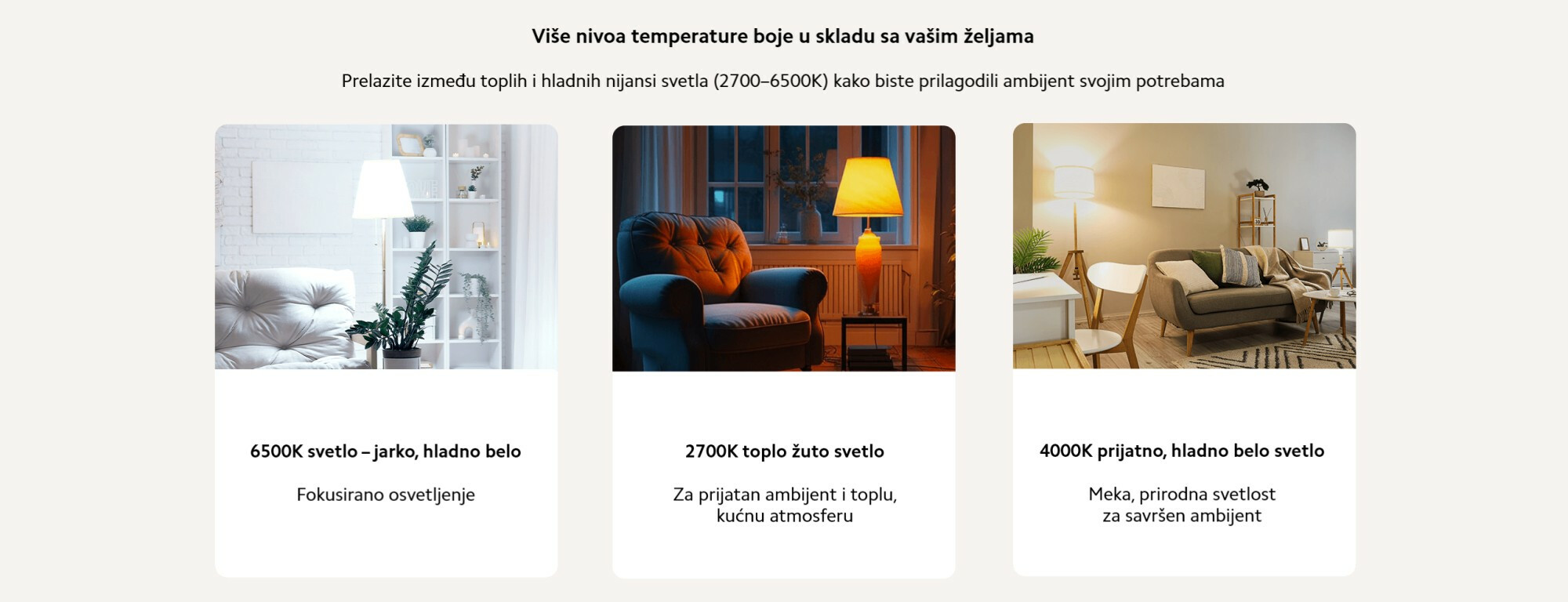 *Zbog konverzije jedinica između Mireds i Kelvina, moguća su manja odstupanja u prikazanoj temperaturi boje prilikom dodavanja osvetljenja sa podrškom za Matter putem aplikacije Xiaomi Home. Ovo je uobičajeno i ne utiče na stvarne performanse.