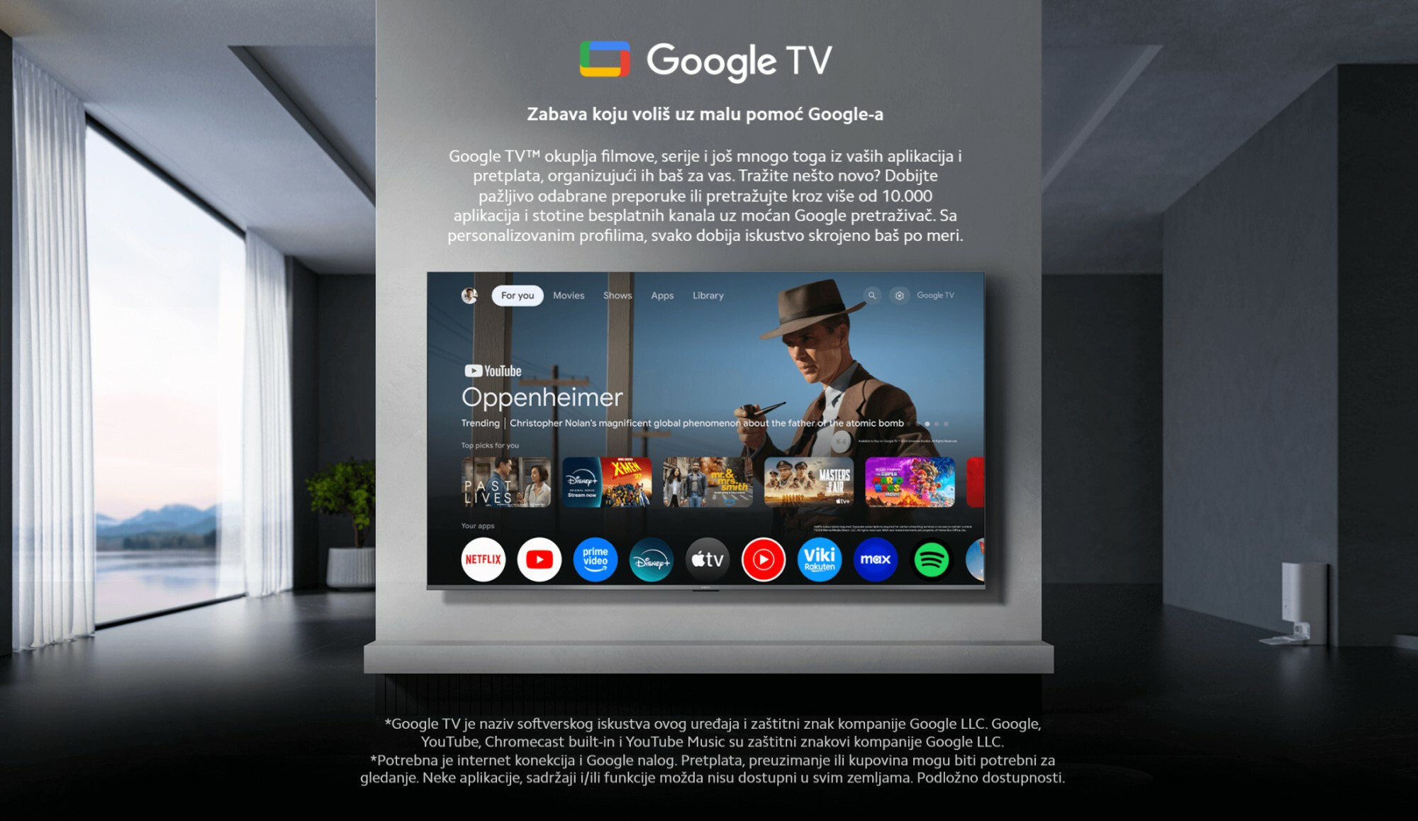 | Smart TV funkcije | Ugrađeni Google Assistant*, Google Cast*, Apple AirPlay*, Google TV, Miracast |