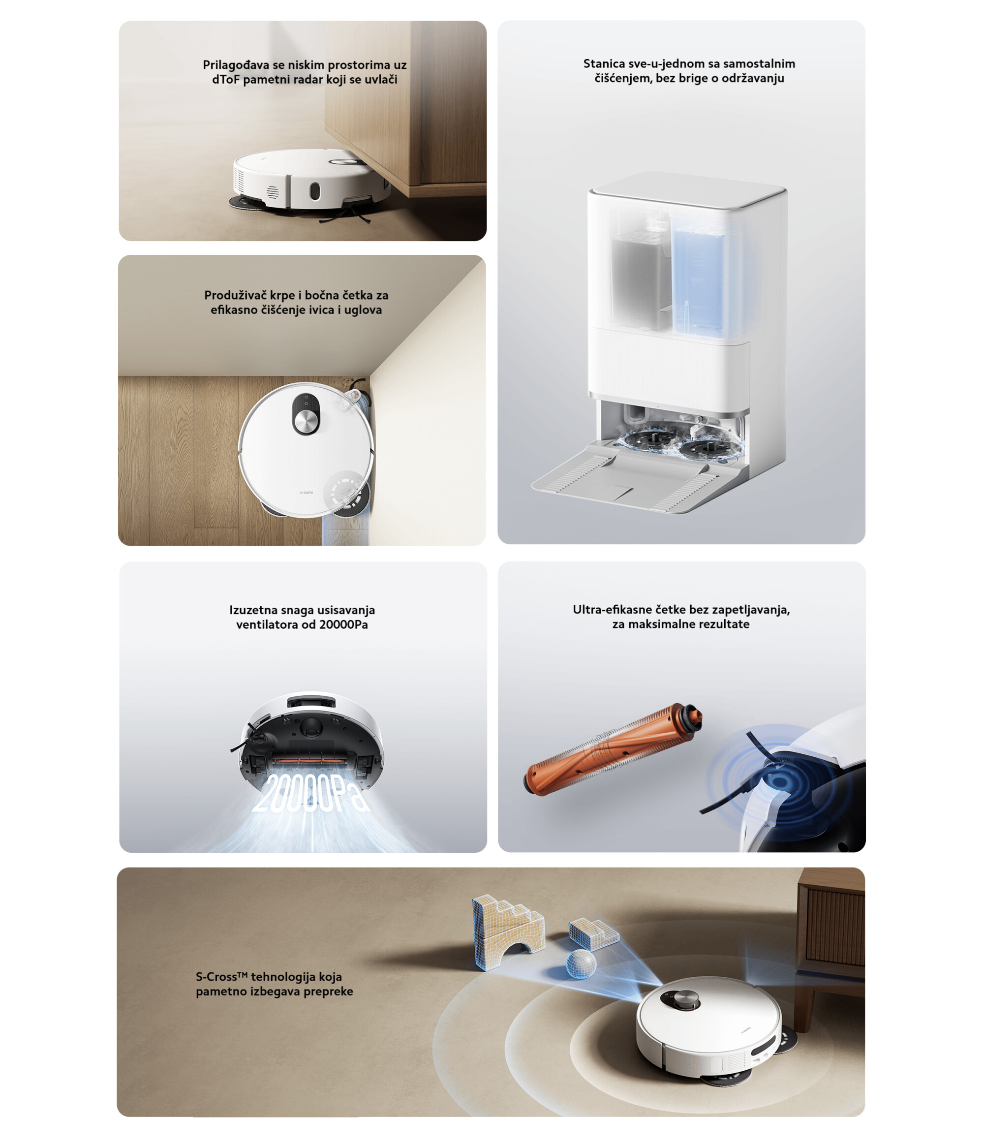| Dodatne informacije | Tehnologija protiv zapetljavanja dlaka; Bočna četka i krpa sa sistemom produživanja; dToF pametni radar; S-Cross™ detekcija prepreka u realnom vremenu; Detekcija tepiha; Pranje vrućom vodom i sušenje na vrućem vazduhu; Xiaomi Home aplikacija |