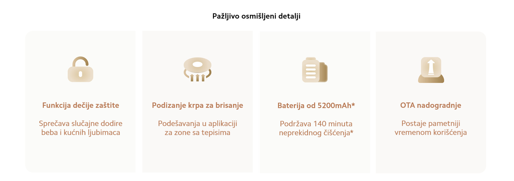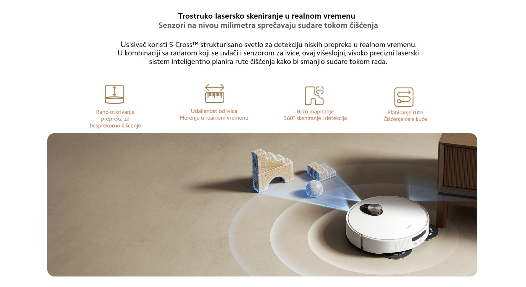 *Zbog varijacija u visini nameštaja i njegovoj strukturi ispod, stvarne performanse usisivača u niskim prostorima mogu varirati. Ukoliko se tokom upotrebe pojave problemi, možete podesiti zone zabranjenog korišćenja ili virtuelne zidove u Xiaomi Home-u. *Osim ako nije drugačije naznačeno, sve gore navedene podatke je dobila Xiaomi Internal Labs pod uslovima testiranja. Za tačne rezultate, pogledajte stvarne performanse.