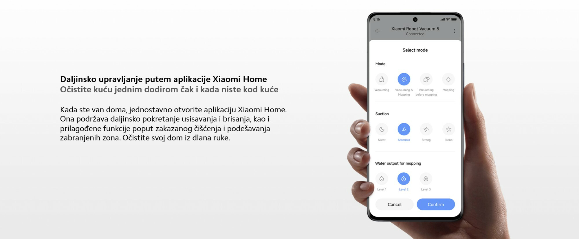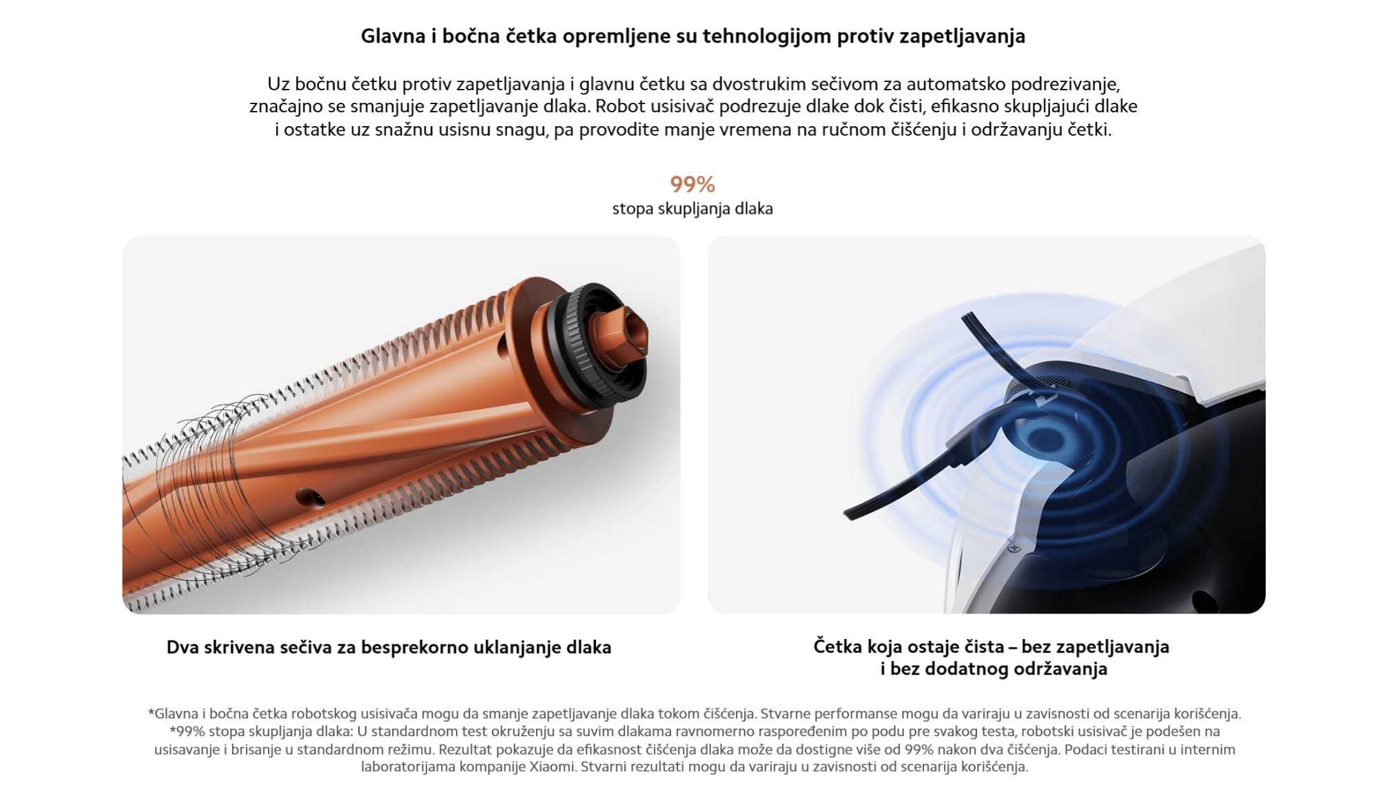 *Stopa usisavanja dlaka od 99%: U standardnom test okruženju sa suvom kosom ravnomerno raspoređenom po podu pre svakog testa, robotski usisivač je podešen na Usisavanje i brisanje podloge u standardnom režimu. Rezultat pokazuje da efikasnost čišćenja dlaka može dostići više od 99% nakon dva čišćenja. Podaci su testirani od strane Xiaomi Internal Labs. Stvarni rezultati mogu varirati u zavisnosti od scenarija upotrebe.