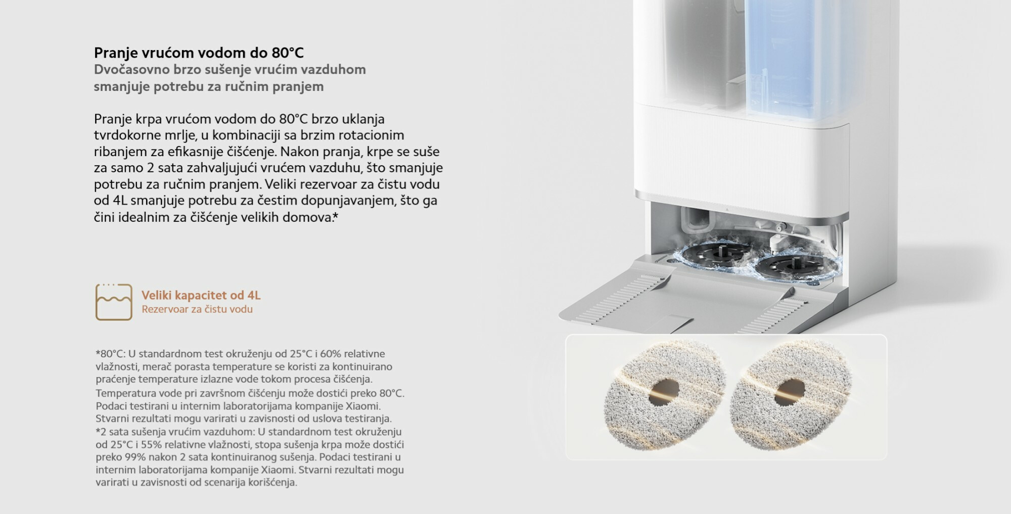 *2 sata sušenja toplim vazduhom: U standardnom test okruženju od 25°C i 55% relativne vlažnosti, brzina sušenja krpica za brisanje može dostići iznad 99% nakon 2 sata kontinuiranog sušenja. Podaci su testirani od strane Xiaomi Internal Labs. Stvarni rezultati mogu varirati u zavisnosti od scenarija upotrebe.