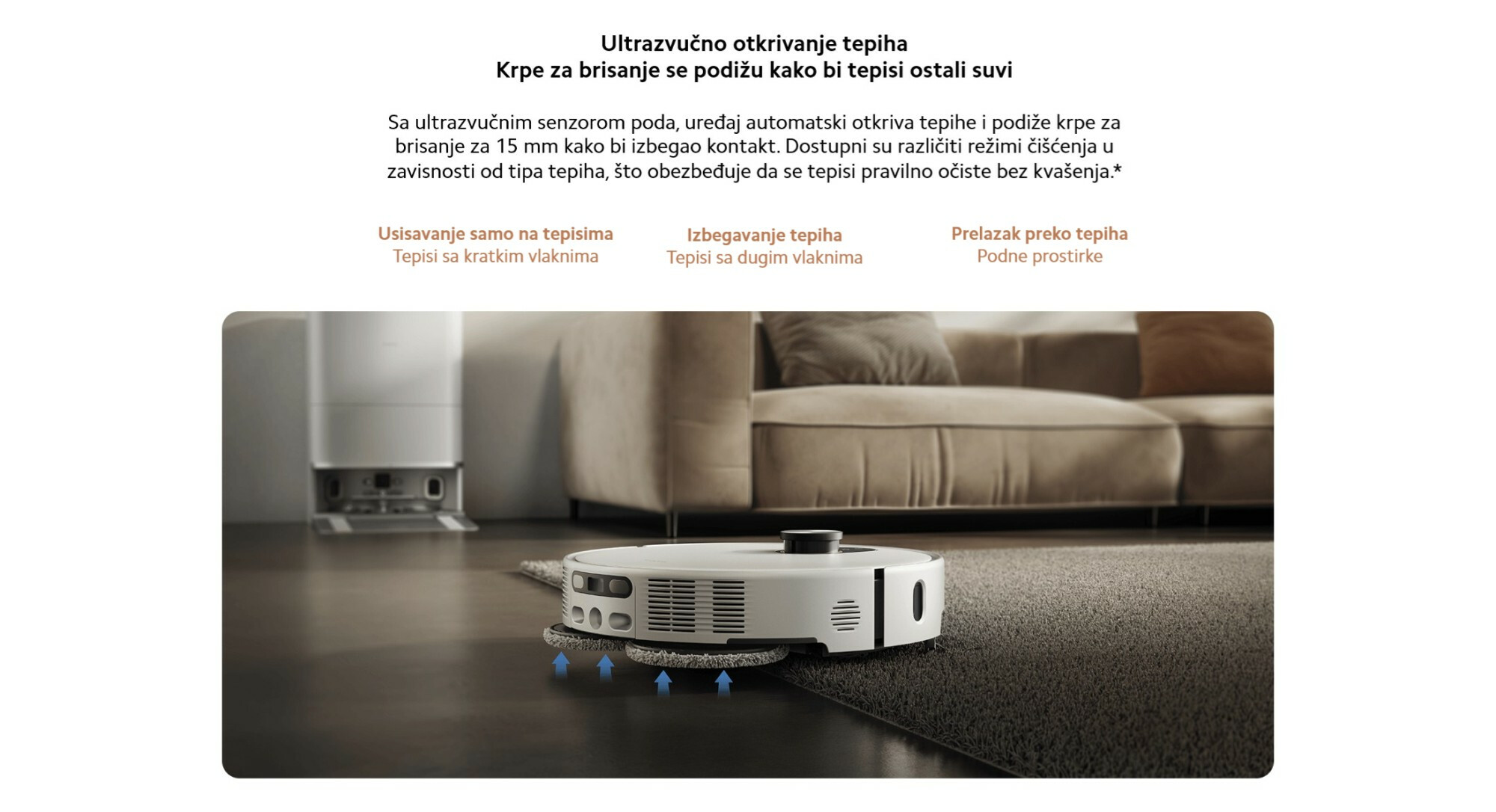 *Krpice za brisanje mogu se automatski podići do 15 mm. Podaci su testirani od strane Xiaomi Internal Labs. Stvarni rezultati mogu varirati u zavisnosti od scenarija upotrebe. Za dugačke tepihe ili pouzdaniji efekat sprečavanja vlaženja, preporučuje se da izaberete režim „Izbegavanje tepiha“ u Xiaomi Home aplikaciji.