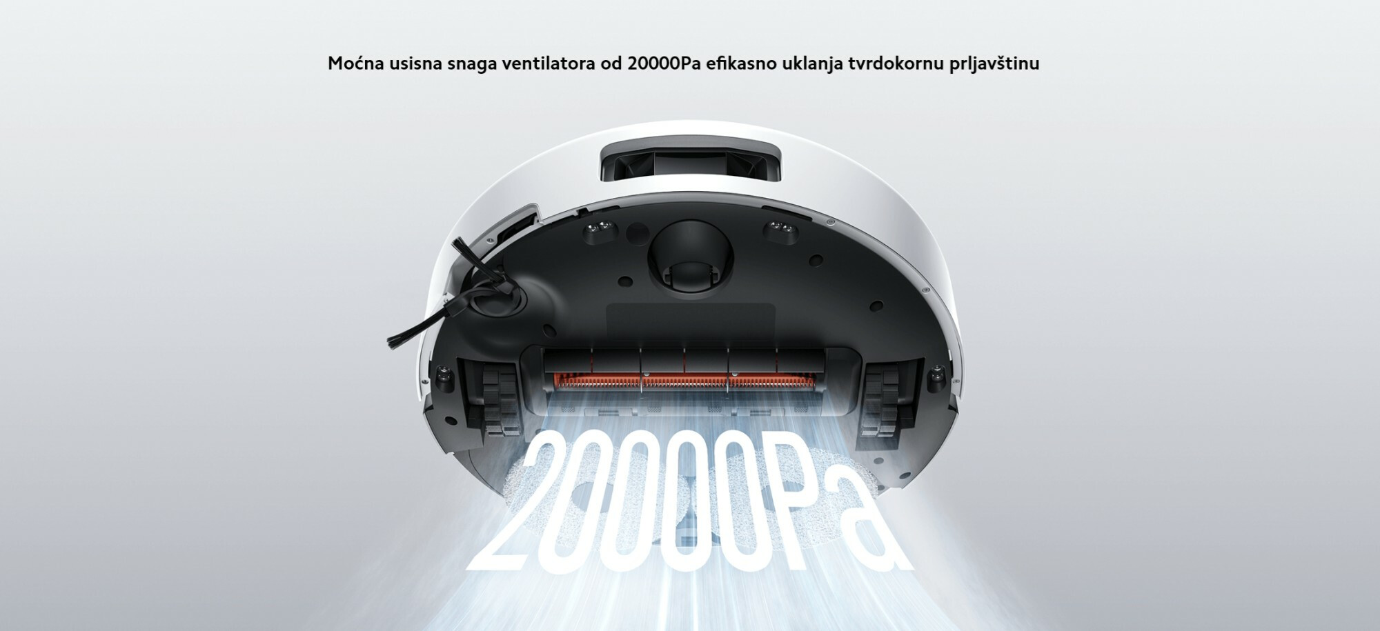 *Test uslov od 20000Pa: Uverite se da je robot usisivač potpuno napunjen. Usisavanje ventilatora je mereno do 20000Pa koristeći stepen vakuuma sa opsegom od 0–20000Pa i tačnošću od 0,01kPa. Podaci su testirani od strane Xiaomi Internal Labs. Snaga usisavanja može varirati u zavisnosti od test okruženja.