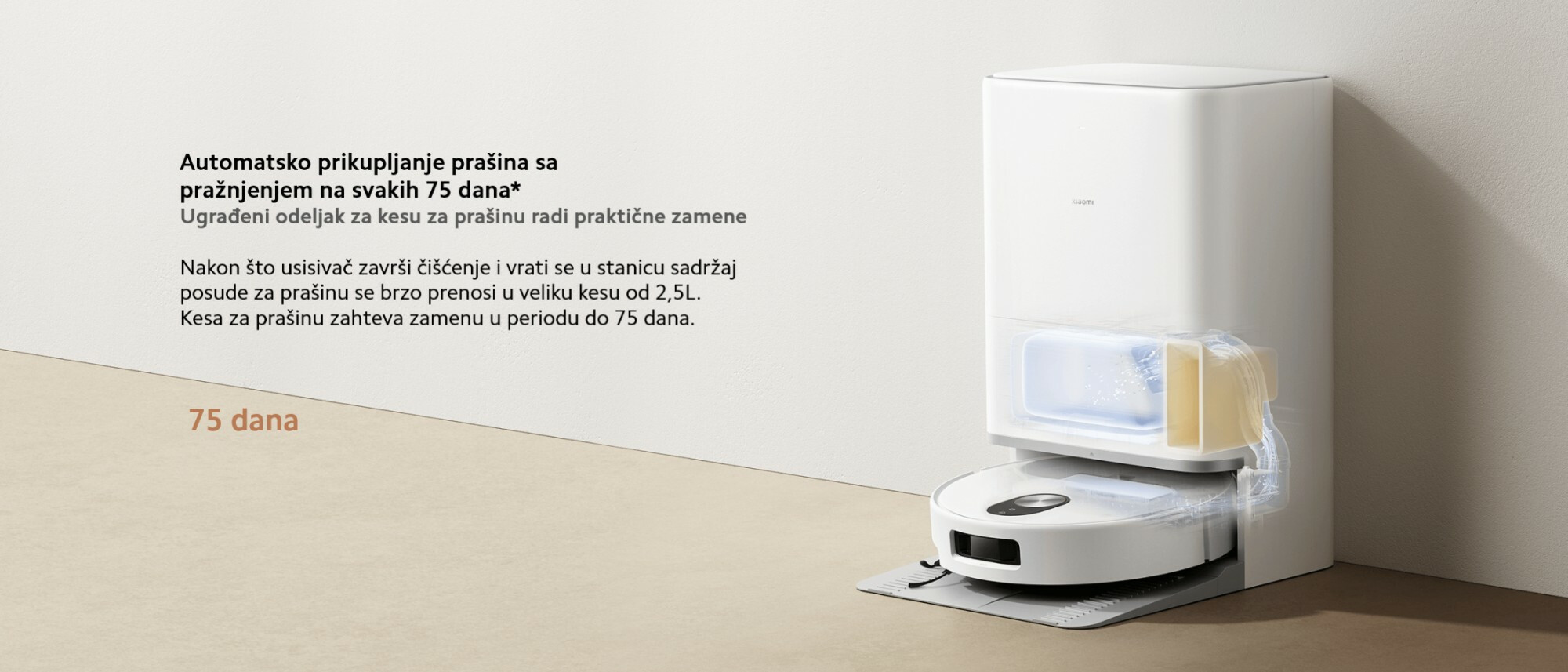 *140 minuta trajanja baterije: Kada je podešeno na usisavanje i brisanje podloge u standardnom režimu i potpuno napunjeno. Podaci su testirani od strane Xiaomi Internal Labs. Stvarni rezultati mogu da variraju u zavisnosti od scenarija korišćenja.