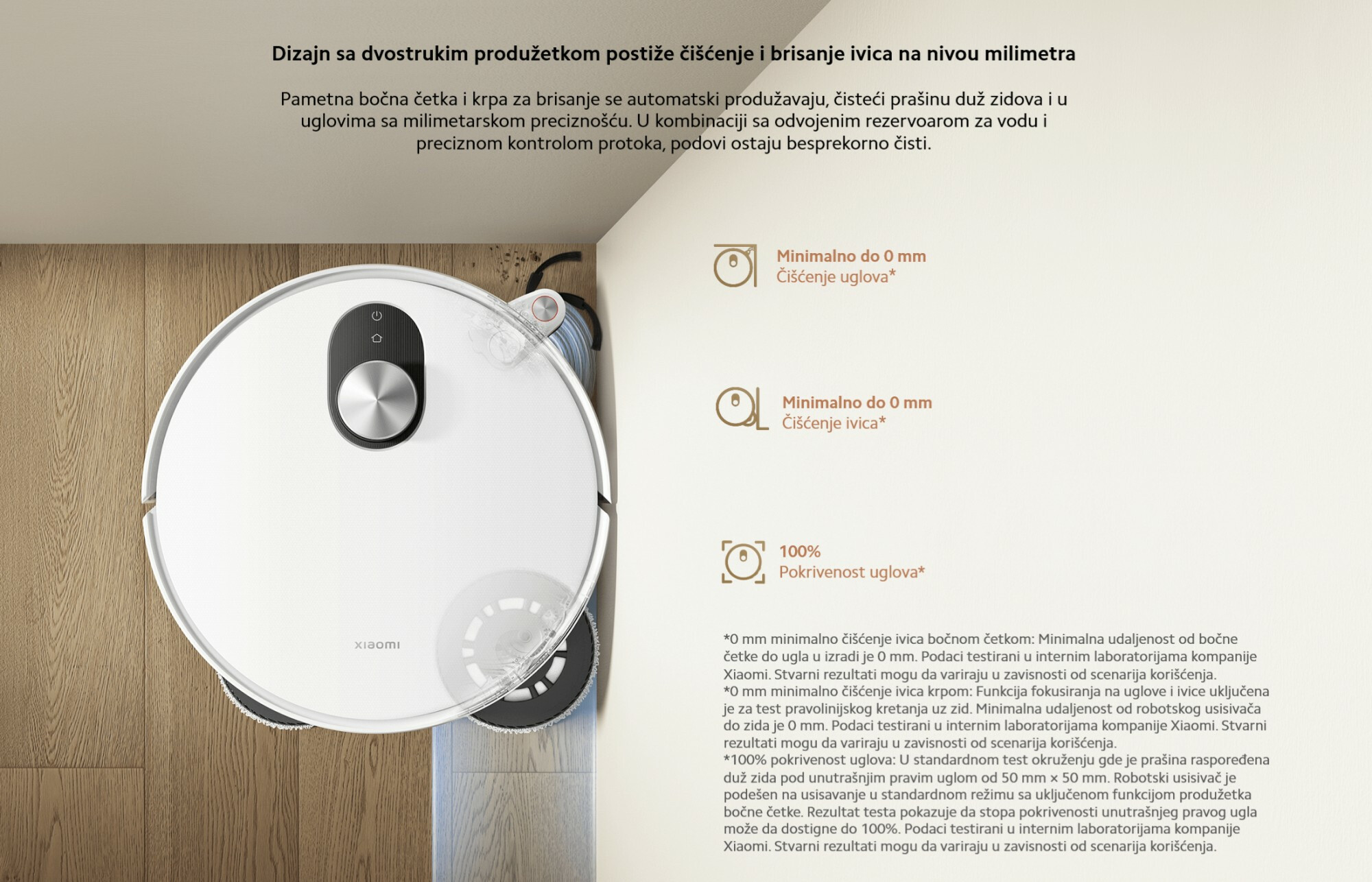 *Minimalno čišćenje ivica krpom od 0 mm: Fokus na uglove i ivice je uključen za test pravolinijskog kretanja duž zida. Minimalno rastojanje od robotskog usisivača do zida je 0 mm. Podaci su testirani od strane Xiaomi Internal Labs. Stvarni rezultati mogu varirati u zavisnosti od scenarija upotrebe.
