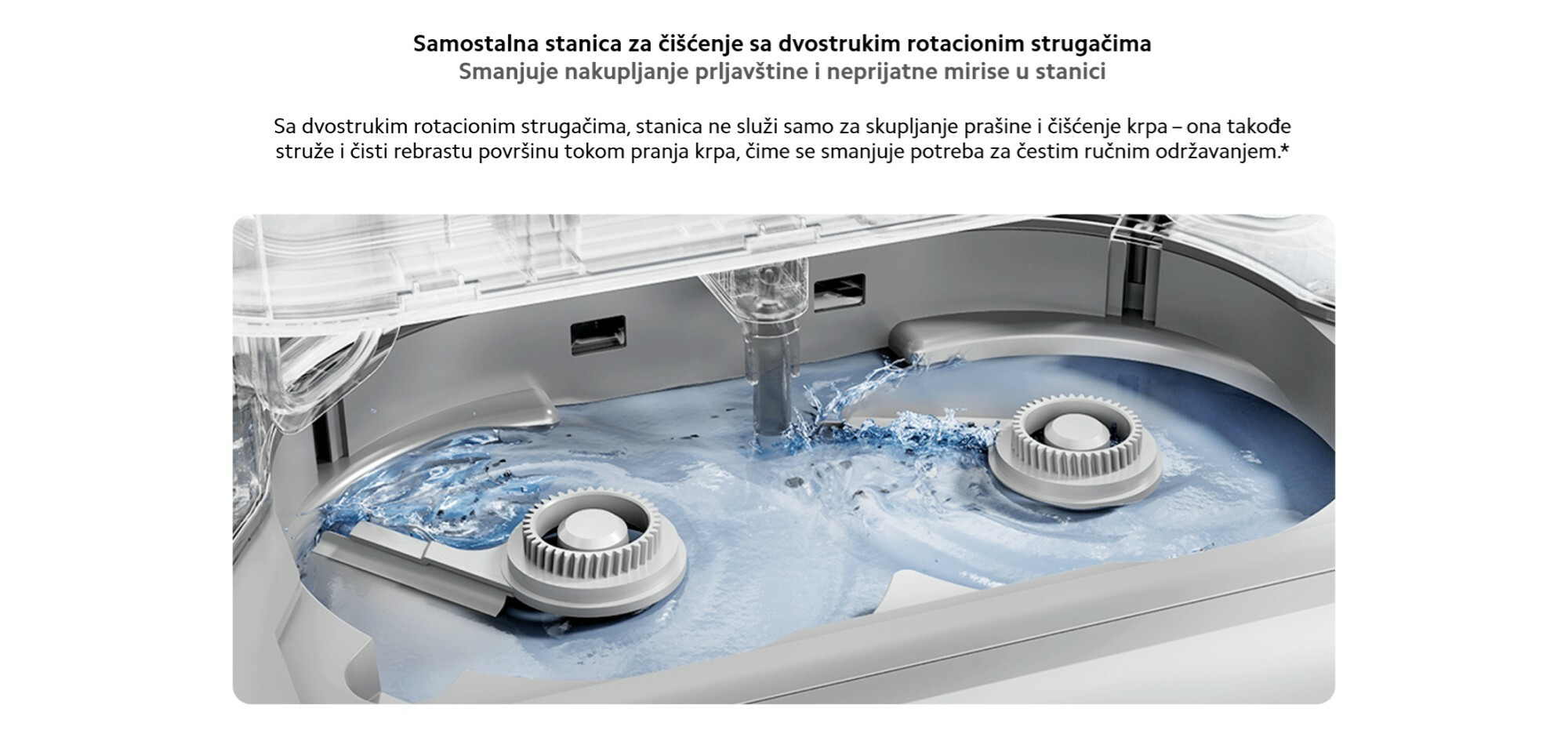*Kako se nakupljanje prašine razlikuje između različitih domova, količina prljavštine koja ostaje na krpicama za brisanje nakon čišćenja će se razlikovati. Funkcija samočišćenja dok stanice pomaže u smanjenju nakupljanja prljavštine i mirisa, ali ih ne eliminiše u potpunosti. Preporučuje se redovno ručno čišćenje.