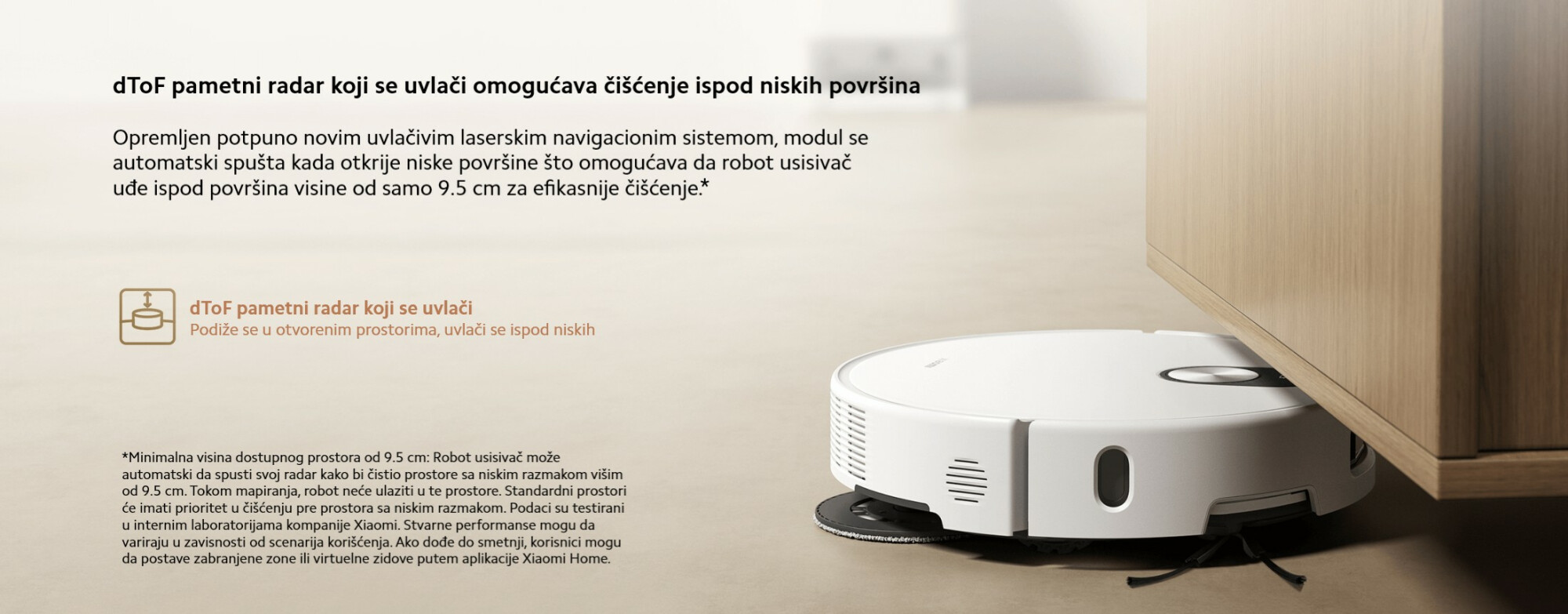 *Minimalna pristupačna visina od 9,5 cm: Robot usisivač može automatski spustiti svoj radar kako bi očistio područja sa niskim prostorom, viša od 9,5 cm. Robot usisivač neće ulaziti u ta područja tokom mapiranja. Standardna područja će imati prioritet za čišćenje pre područja sa niskim prostorom. Podaci su testirani od strane Xiaomi Internal Labs. Stvarne performanse mogu varirati u zavisnosti od scenarija korišćenja. Ukoliko dođe do smetnji, korisnici mogu podesiti ograničena područja ili virtuelne zidove putem Xiaomi Home aplikacije.