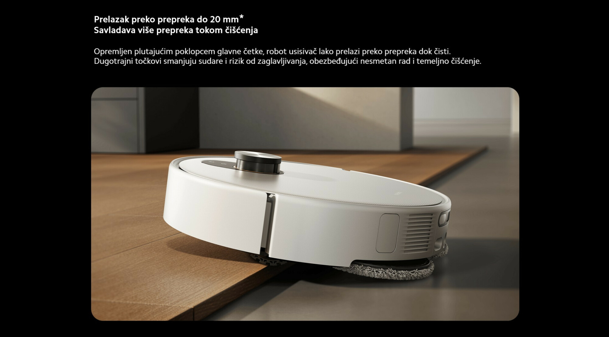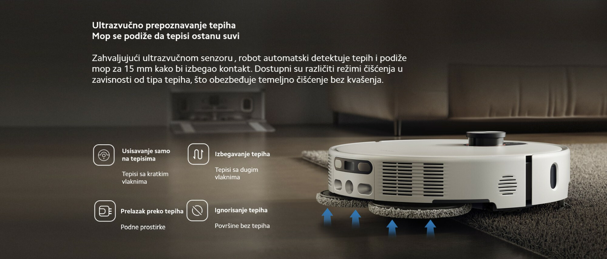 *Krpe za brisanje mogu se automatski podići do 15mm. Podaci su testirani od strane Xiaomi Internal Labs. Stvarni rezultati mogu da variraju u zavisnosti od scenarija upotrebe. Za dugačke tepihe ili pouzdaniji efekat protiv vlaženja, preporučuje se da izaberete režim „Izbegavanje tepiha“ u Xiaomi Home aplikaciji.