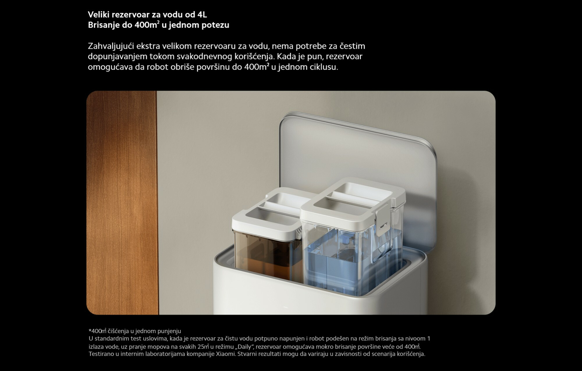 *400㎡: U standardnom test okruženju, rezervoar za čistu vodu je potpuno napunjen, robot usisivač je podešen na režim brisanja, nivo 1 izlaza vode za brisanje. Pranje mopa sa „dnevnim“ izlazom vode svakih 25㎡. Rezervoar za čistu vodu može da pokvasi više od 400㎡ stvarne površine čišćenja. Podaci su testirani od strane Xiaomi Internal Labs. Stvarni rezultati mogu da variraju u zavisnosti od scenarija korišćenja.