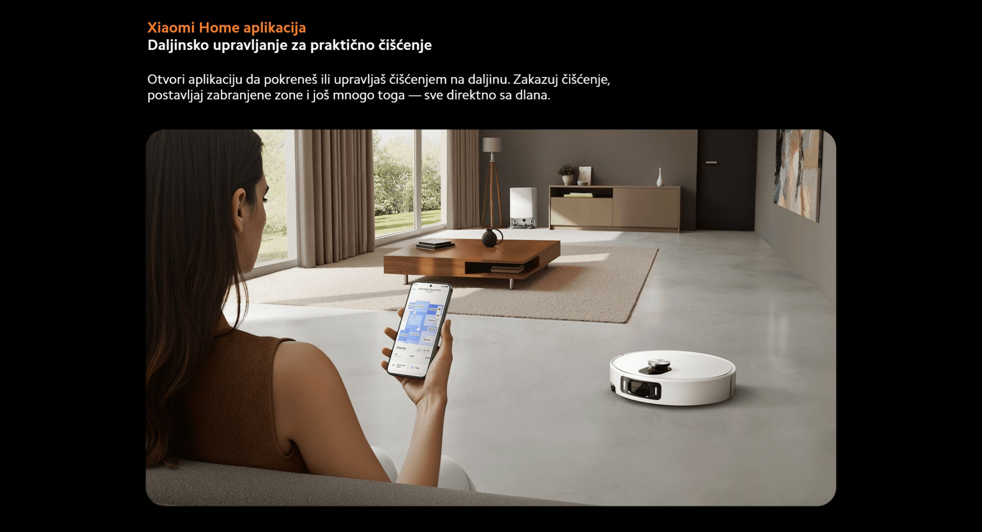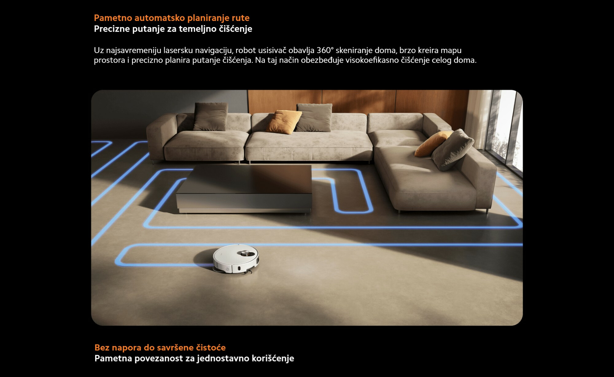 *Brzina sakupljanja dlaka od 99%: U standardnom test okruženju sa suvom kosom ravnomerno raspoređenom po podu pre svakog testa, a robot usisivač je podešen na Usisavanje i brisanje podloge u standardnom režimu. Rezultati pokazuju da efikasnost čišćenja dlaka može preći 99% nakon dva prolaza. Podaci su testirani od strane Xiaomi Internal Labs. Stvarni rezultati mogu varirati u zavisnosti od scenarija upotrebe.
