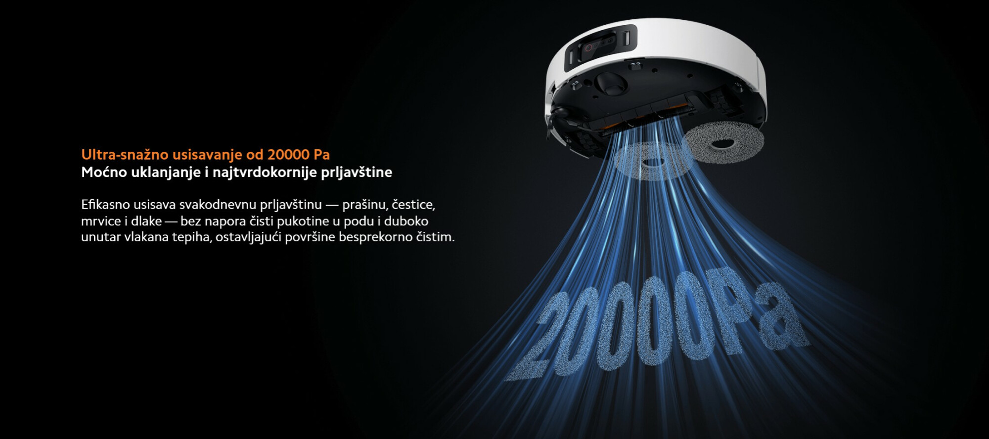 *Ventilator Xiaomi Robot Vacuum 5 Pro generiše vazdušni pritisak do 20000Pa. Podaci su testirani od strane Xiaomi Internal Labs. Snaga usisavanja može varirati u zavisnosti od okruženja za testiranje.