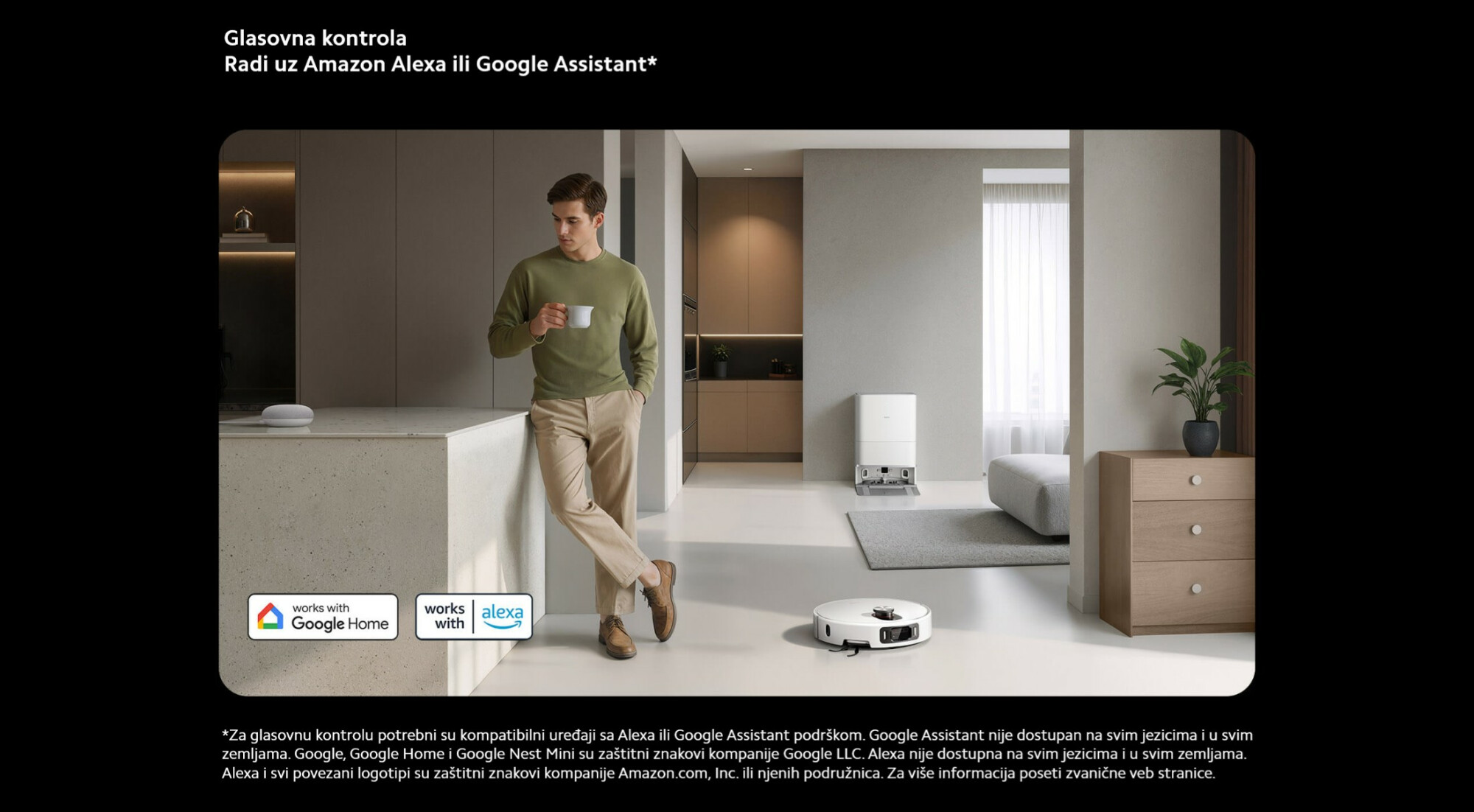 *Potrebni su kompatibilni uređaji sa omogućenom Aleksom i Google asistentom. Google asistent nije dostupan na određenim jezicima i u određenim zemljama. Google, Google Home i Google Nest Mini su zaštitni znaci kompanije Google LLC. Alexa nije dostupna na određenim jezicima i u određenim zemljama. Alexa i svi povezani logotipi su zaštitni znaci kompanije Amazon.com, Inc. ili njenih filijala. Za više informacija pogledajte zvanične veb stranice.