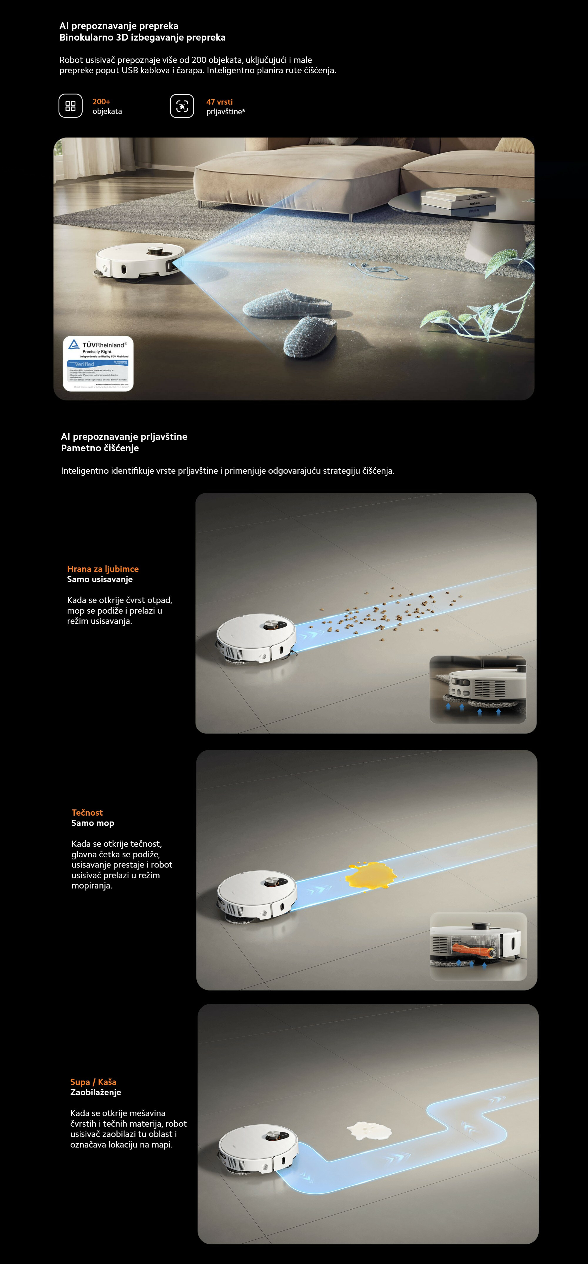 *Pokretan obukom modela veštačke inteligencije, robot usisivač može da identifikuje oko 200 uobičajenih prepreka u osam kategorija – uključujući obuću, tkaninu i još mnogo toga – sa minimalnom mogućnošću detekcije kablova slušalica prečnika 3 mm, i do 47 uobičajenih mrlja u tri kategorije – uključujući tečnosti, čvrste materije i mešovite čvrste materije. Performanse mogu da variraju u zavisnosti od faktora kao što su kućno okruženje i veličina prepreke. Molimo pogledajte stvarni scenario upotrebe. Podatke testirale TÜV Rheinland Laboratories. Izveštaj br. CN25CWFC001.
