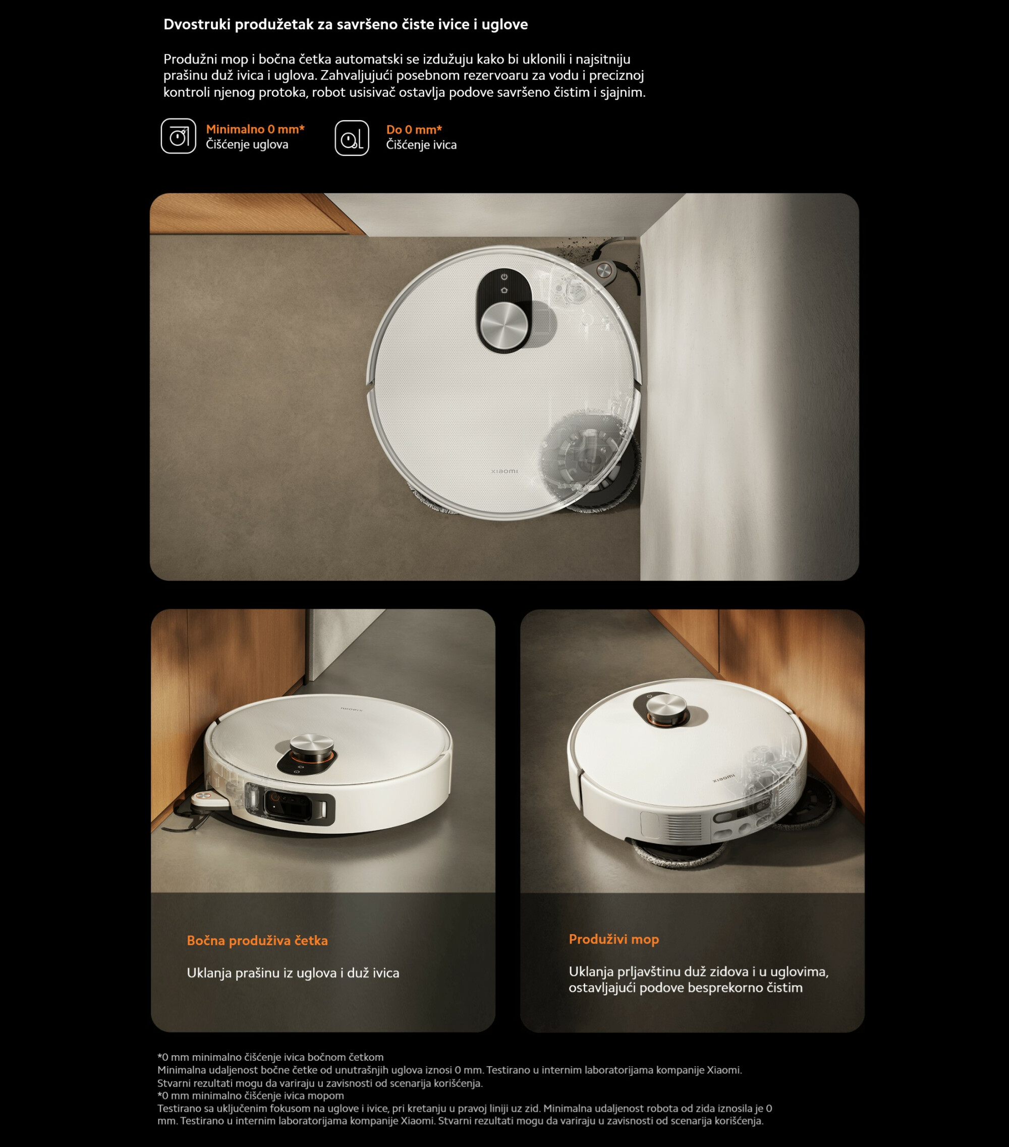 *Minimalno čišćenje ivica krpom od 0 mm: Testirano sa uključenim fokusom na uglove i ivice, a zatim pokretom u pravoj liniji duž zida. Minimalno rastojanje od robot usisivača do zida bilo je 0 mm. Podaci su testirani od strane Xiaomi Internal Labs. Stvarni rezultati mogu varirati u zavisnosti od scenarija korišćenja.