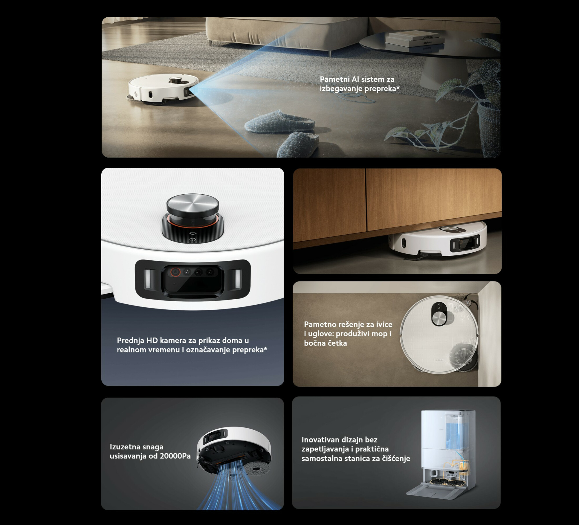 | Dodatne informacije | Kapacitet tenka za vodu u stanici: 4L; Pranje tkanine na temperaturi od 80°C; Sušenje tkanine na vrućem vazduhu; Pametno planiranje rute i sistem detekcije; Sistem protiv zapetljavanja dlaka; Prepoznavanje tepiha; HD kamera |