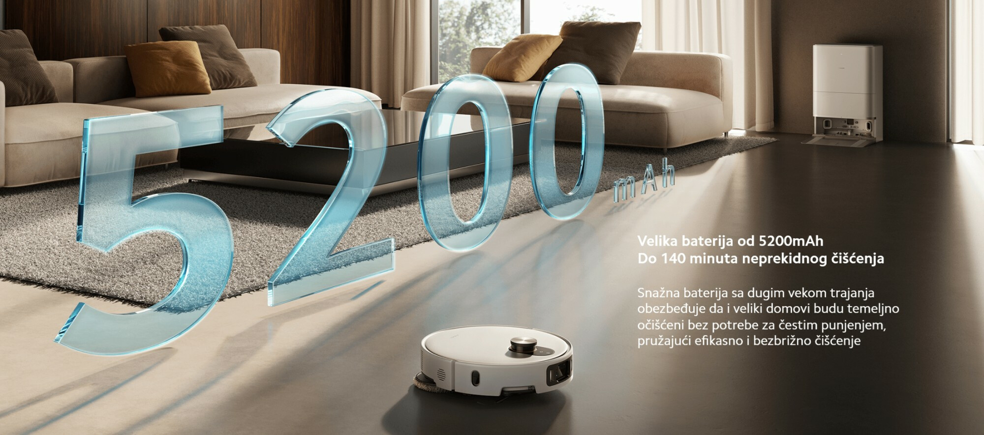 *140 minuta trajanja baterije: Kada je podešeno na usisavanje i brisanje podloge u standardnom režimu i potpuno napunjeno. Podaci su testirani od strane Xiaomi Internal Labs. Stvarni rezultati mogu da variraju u zavisnosti od scenarija korišćenja.