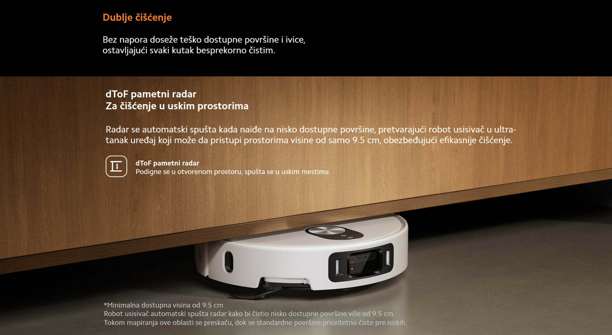 *Minimalna pristupačna visina od 9,5 cm: Robot usisivač može automatski spustiti svoj radar kako bi očistio područja sa malim prostorom viša od 9,5 cm. Ova područja se preskaču tokom mapiranja. Standardna područja imaju prioritet za čišćenje pre područja sa malim prostorom. Podatke testirale Xiaomi Internal Labs. Stvarne performanse mogu da variraju u zavisnosti od scenarija upotrebe. Ukoliko dođe do smetnji, korisnici mogu podesiti ograničene oblasti ili virtuelne zidove putem aplikacije Xiaomi Home.
