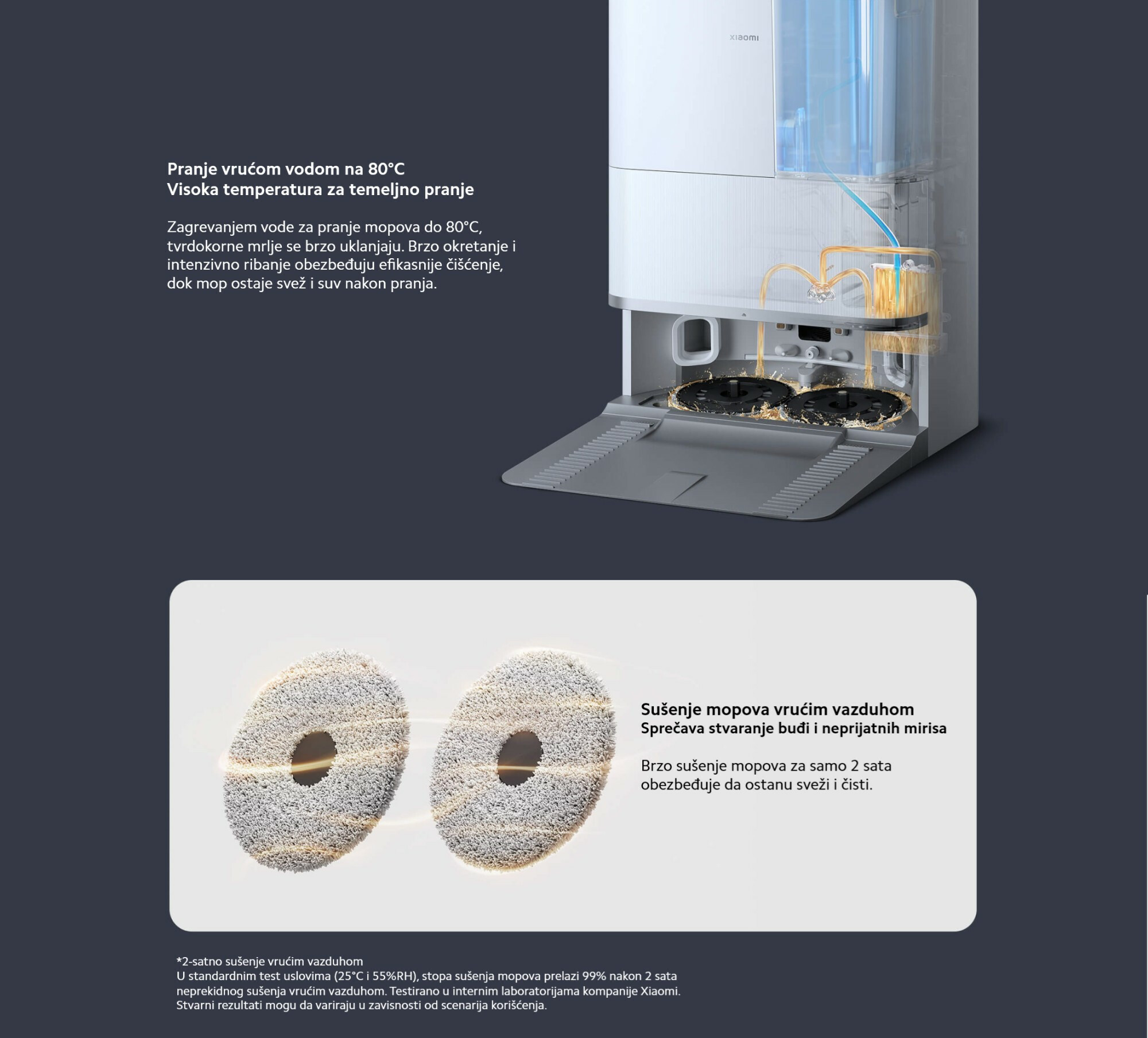 *75 dana: U testovima sprovedenim u kući od 120 m2 sa porodicom od tri člana i jednim kućnim ljubimcem, robot usisivač čisti jednom dnevno pre nego što se vrati na baznu stanicu radi sakupljanja prašine. Zapremina otpada u kesi za prašinu merena je svakih pet dana, što pokazuje da može da traje preko 75 dana bez pražnjenja. Podaci su testirani od strane Xiaomi Internal Labs. Stvarni rezultati mogu da variraju u zavisnosti od scenarija korišćenja.