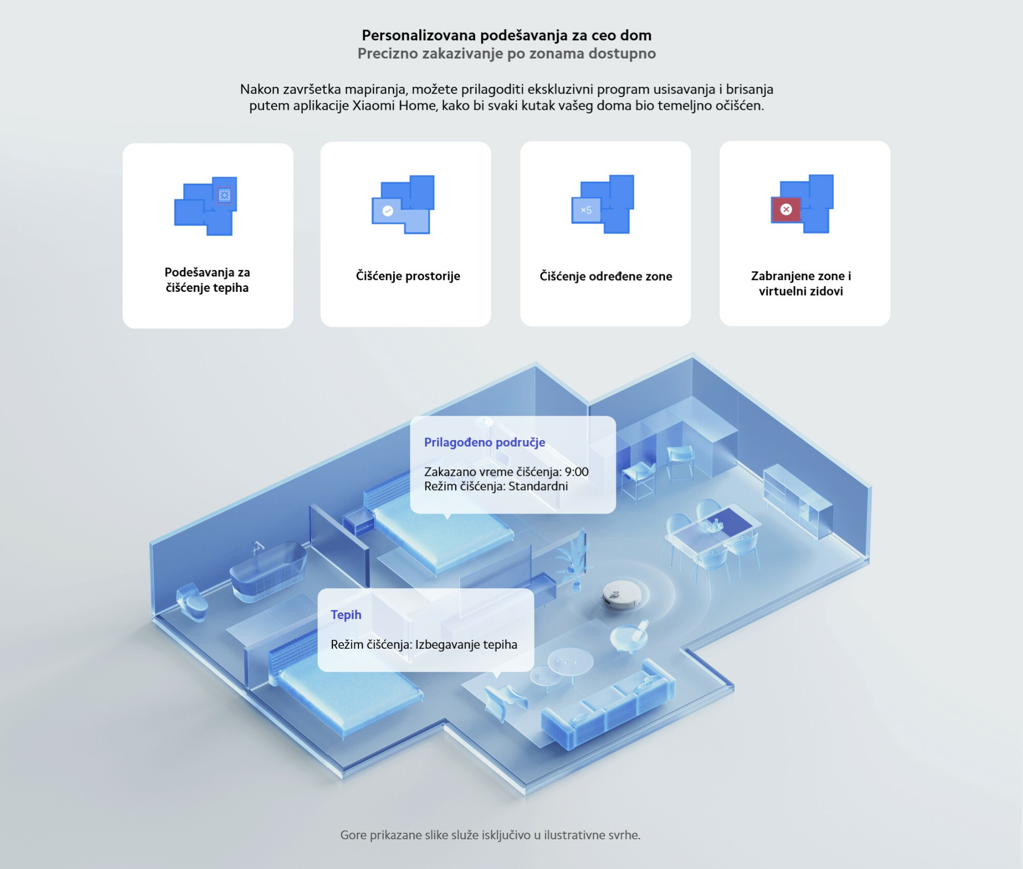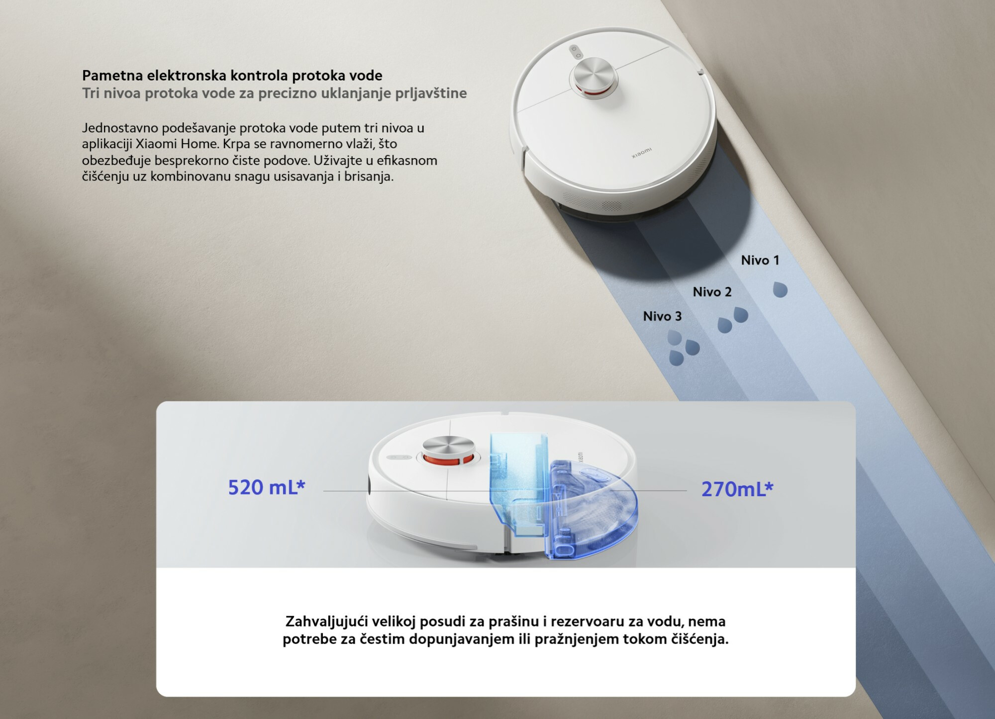 *180 minuta: Podaci testirani od strane proizvođača. Uzorak robotskog usisivača je potpuno napunjen i testiran na otvorenoj pločastoj površini pri različitim nivoima snage. Radno vreme je zabeleženo do trenutka kada je usisivač započeo povratak, a ukupna površina čišćenja prikazana u aplikaciji Xiaomi Home. U ovim uslovima, robot može usisavati i brisati ≥180 minuta u standardnom režimu tokom jedne sesije. Stvarne performanse mogu varirati u zavisnosti od uslova korišćenja, vrste poda i drugih faktora.
