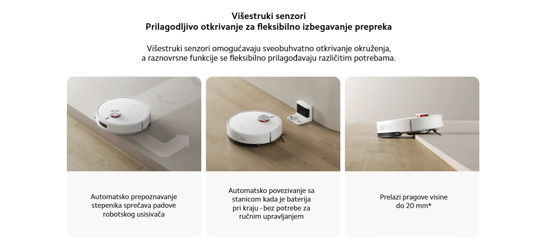 *20mm: Podaci testirani od strane proizvođača. Kada je krpa za brisanje suva, robotski usisivač može savladati prepreke visine do 20mm. Stvarni rezultati mogu varirati u zavisnosti od uslova korišćenja.