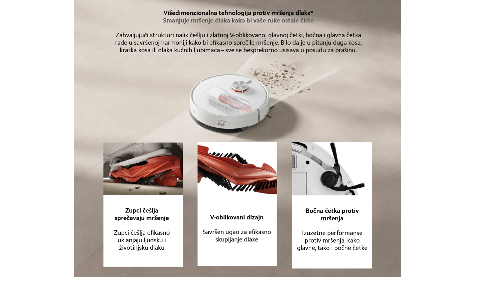 *Anti-tangle: Odnosi se na smanjenje zapetljavanja dlaka u glavnoj i bočnoj četki tokom usisavanja. Stepen zapetljavanja može varirati u različitim okruženjima.