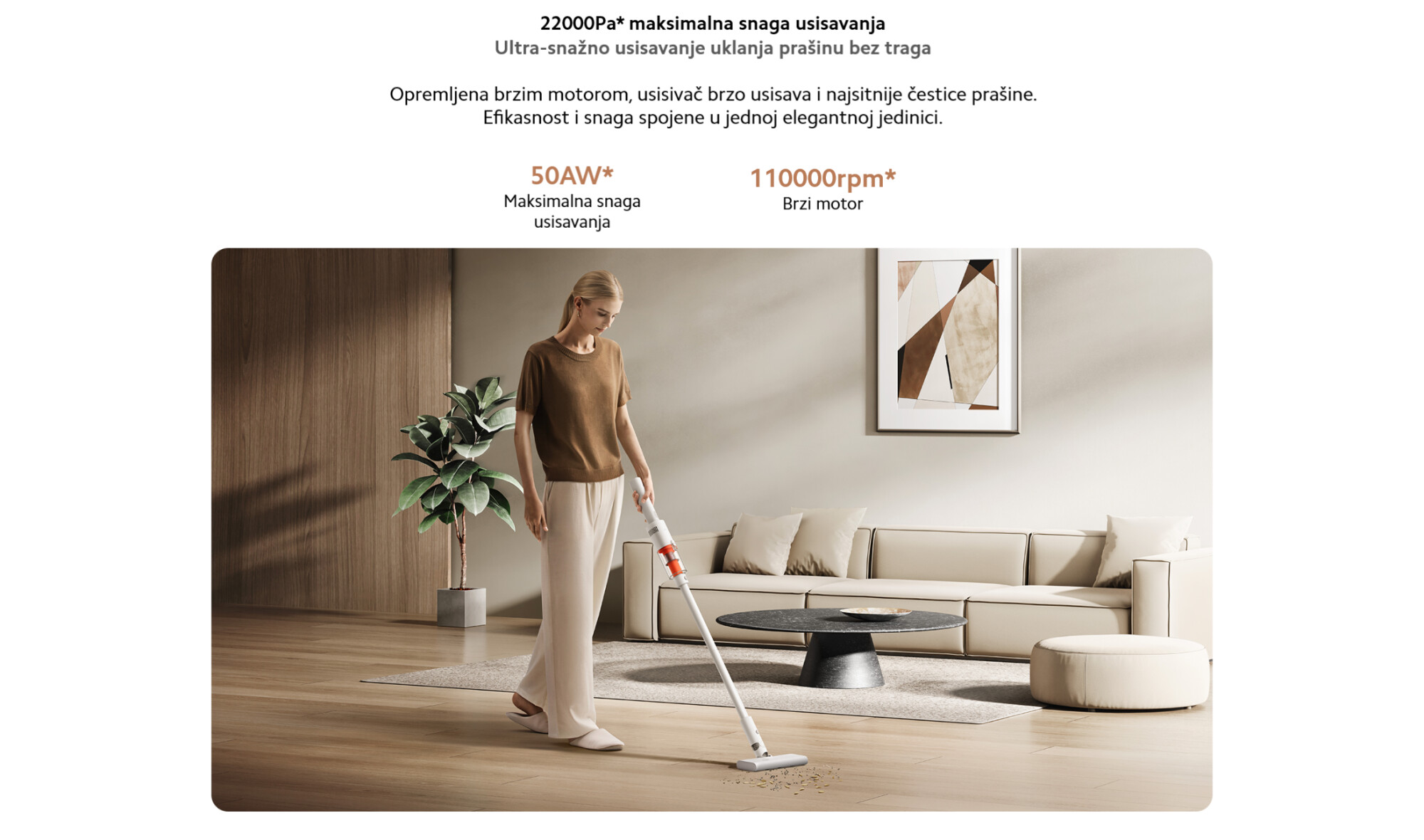 *Maksimalna usisna snaga od 22.000 Pa: Testirao Suzhou GTT Service Co., Ltd. Kada je potpuno napunjena, glavna jedinica može postići maksimalnu usisnu snagu od 22 kPa u Turbo režimu. Stvarne performanse mogu varirati u zavisnosti od uslova korišćenja, materijala poda i drugih faktora. Broj izveštaja: 0768-25A-01.