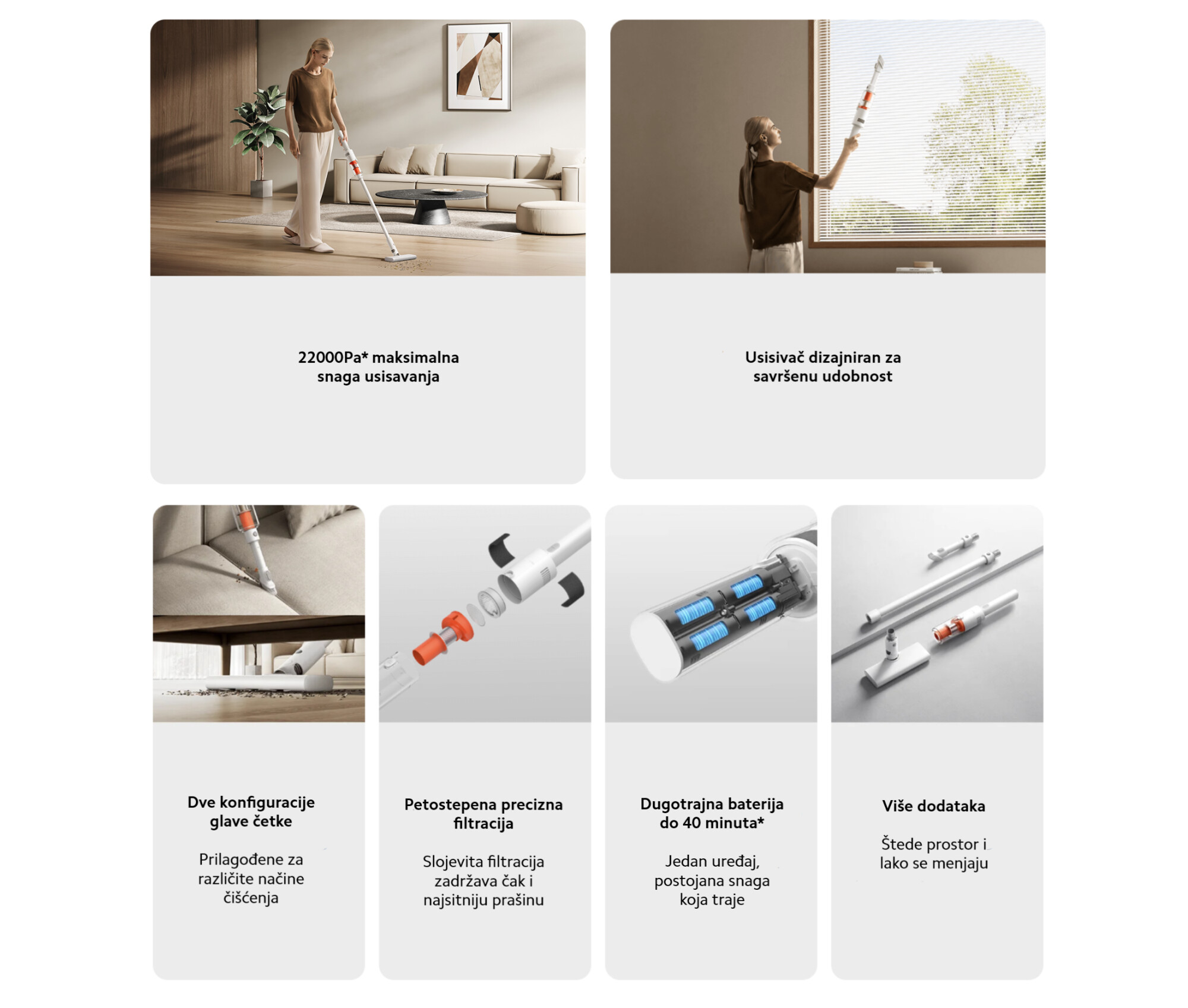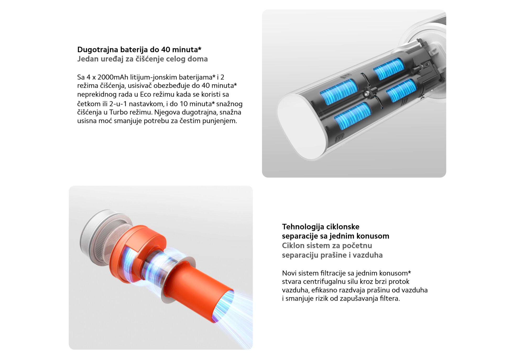 *Baterija dugog trajanja od 40 minuta: Testirao Suzhou GTT Service Co., Ltd. U eko režimu, koristeći glavnu jedinicu sa četkicom ili 2-u-1 četkom za pukotine, baterija je trajala najmanje 40 minuta. Broj izveštaja: 0768-25A-01.