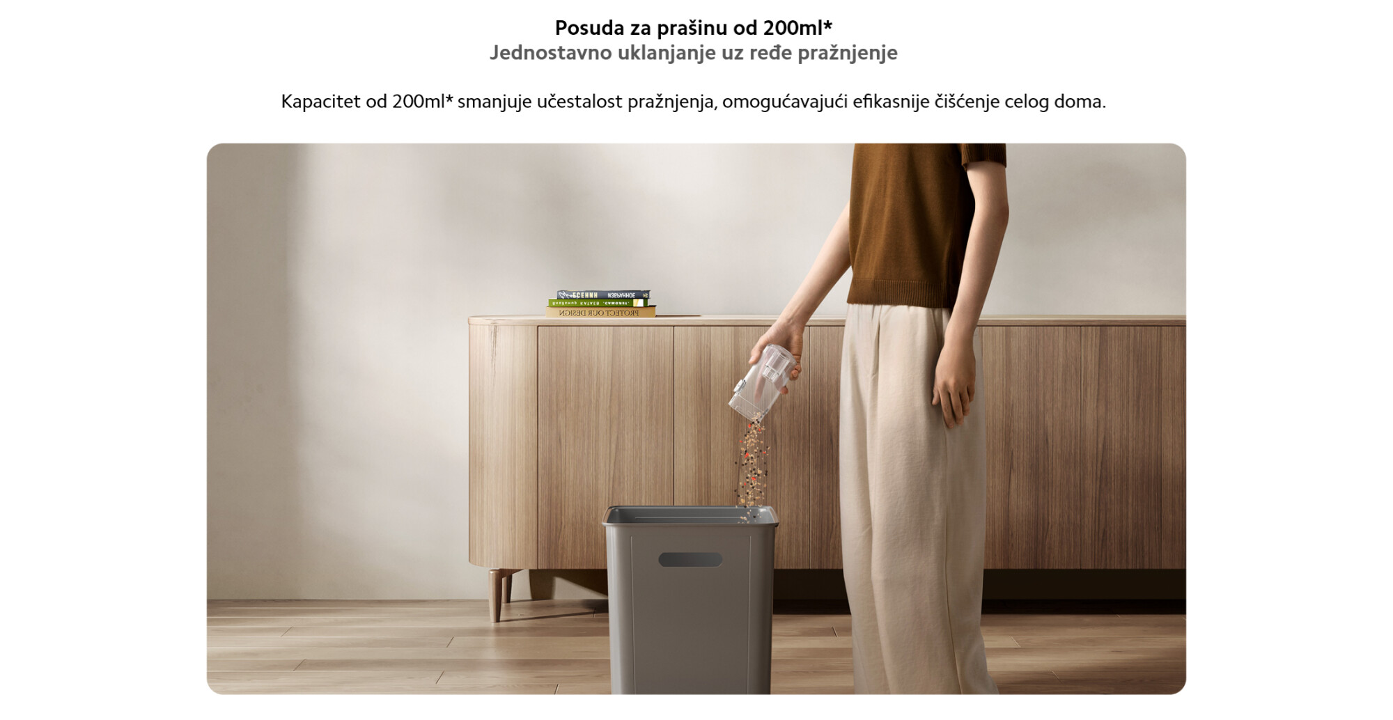 *Odeljak za prašinu od 200 ml: Testirao Suzhou GTT Service Co., Ltd. Odeljak za prašinu ima ukupni kapacitet preko 200 ml. Linija „Max“ označava preporučeni nivo punjenja i ne predstavlja ukupan kapacitet. Za optimalne performanse usisavanja, ispraznite odeljak pre nego što dostignete liniju „Max“. Broj izveštaja: 0768-25A-01.
