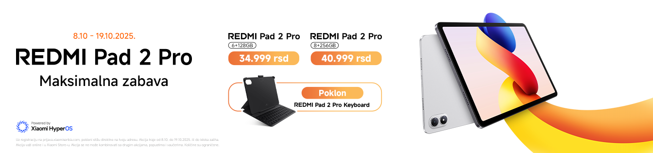 Kupovinom tableta Redmi Pad 2 Pro u promotivnom periodu od 8.10.2025. do 19.10.2025. ostvaruješ pravo na poklon.