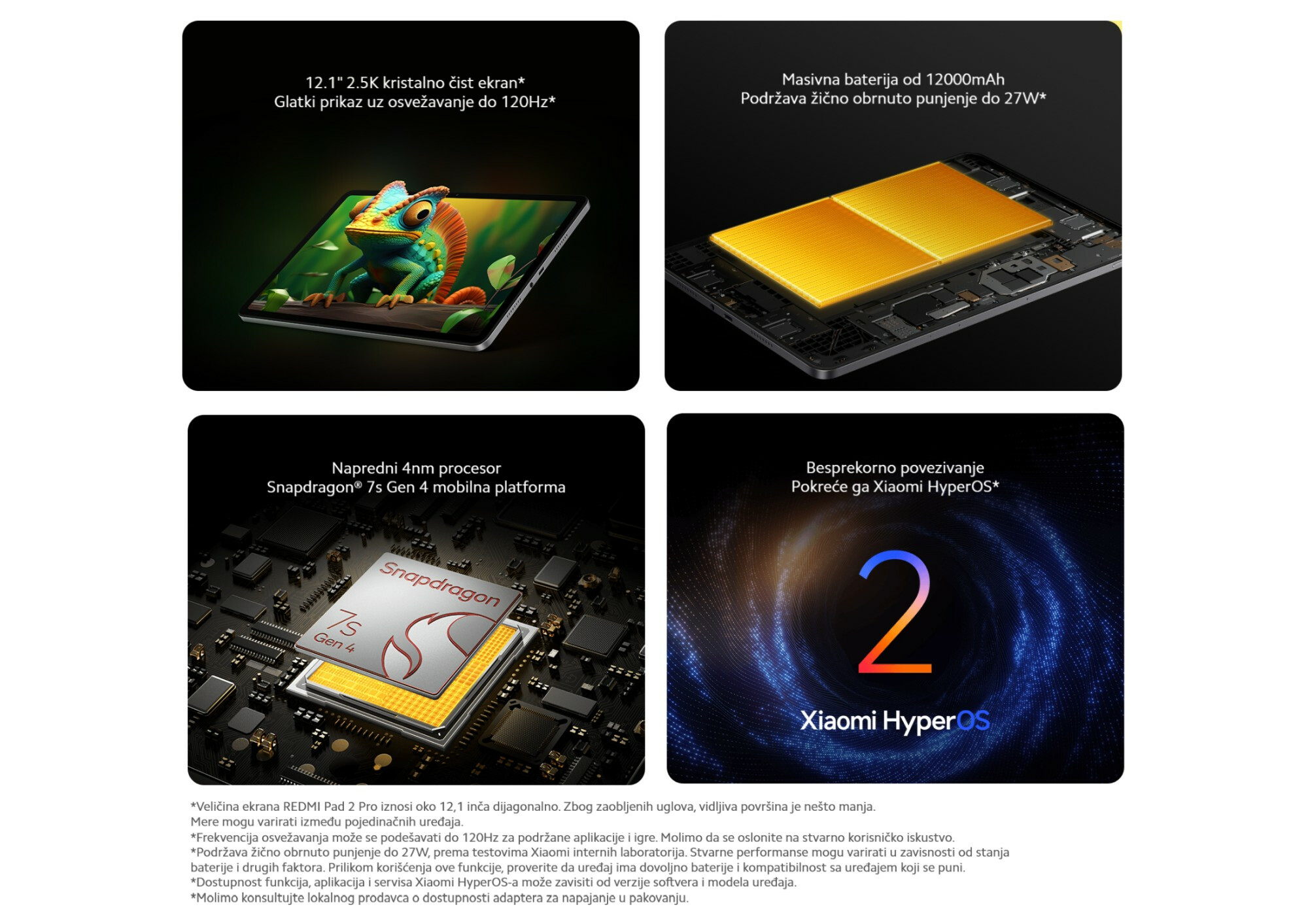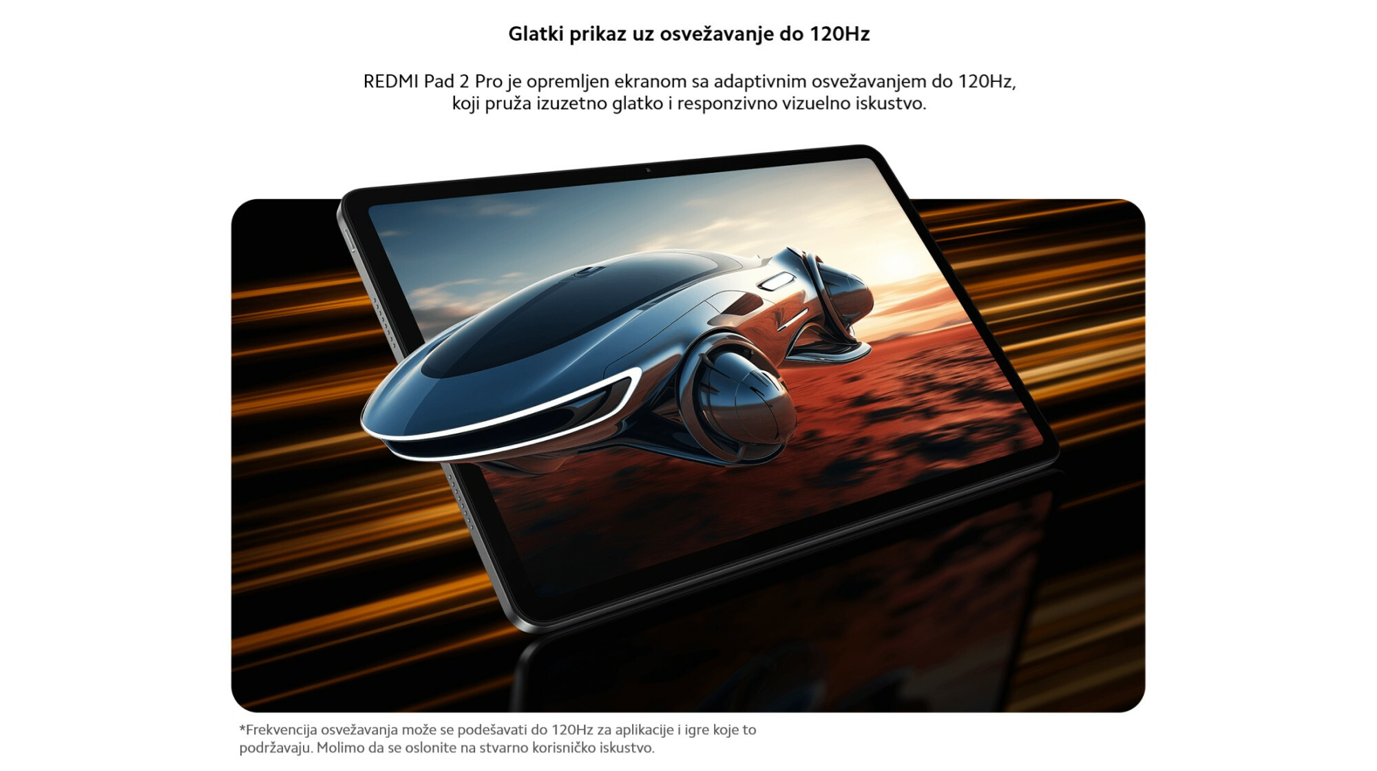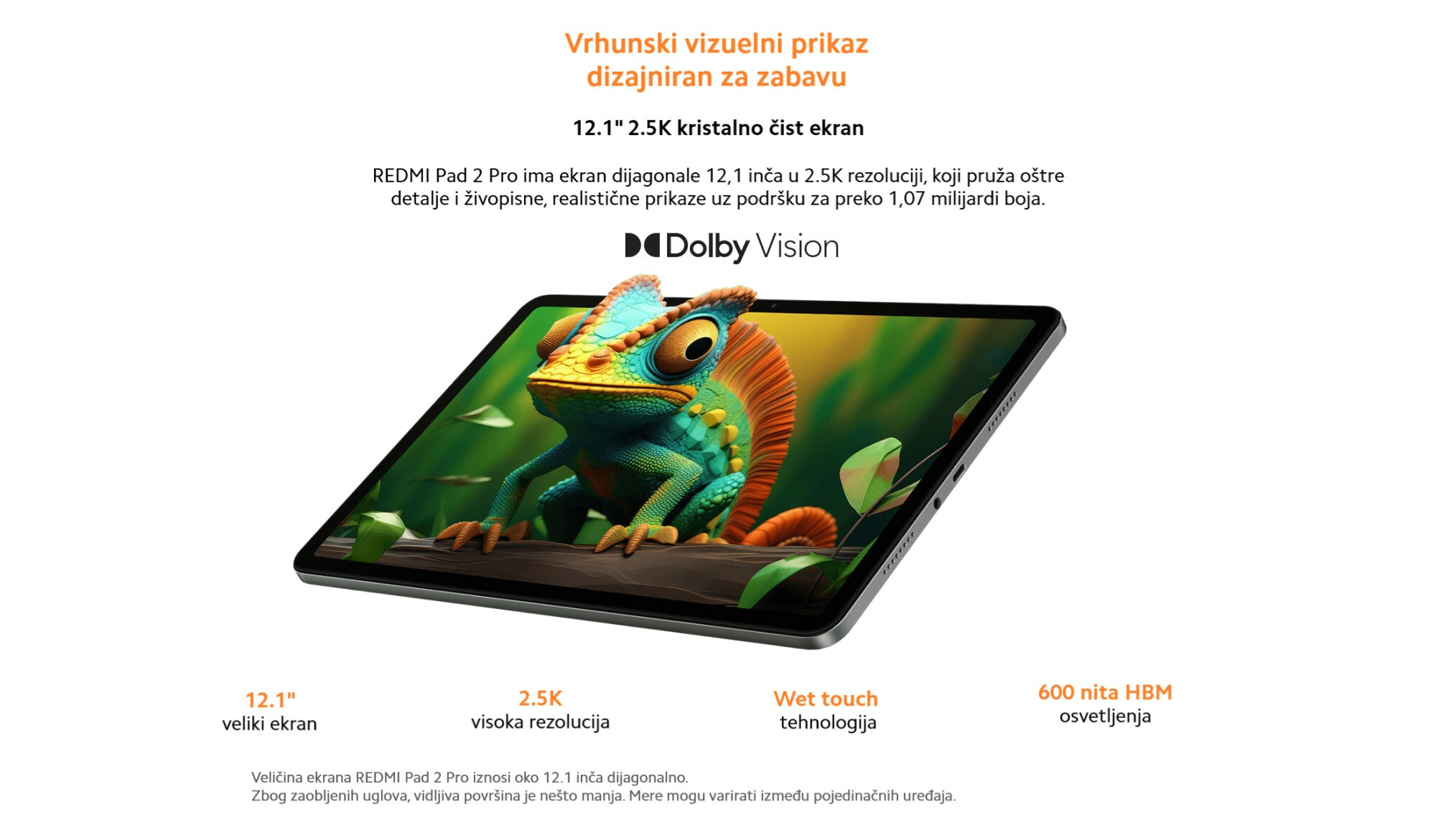 *Veličina ekrana Redmi Pad 2 Pro iznosi oko 12,1 inča dijagonalno. Vidljiva površina je manja zbog zaobljenih uglova. Mere mogu varirati između pojedinačnih uređaja
