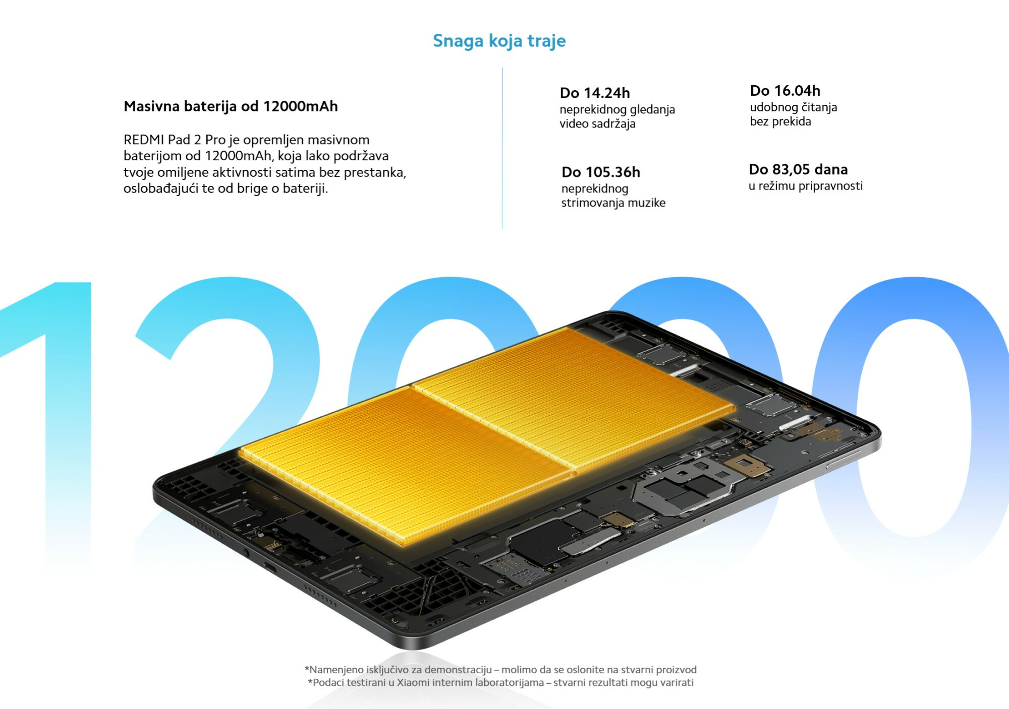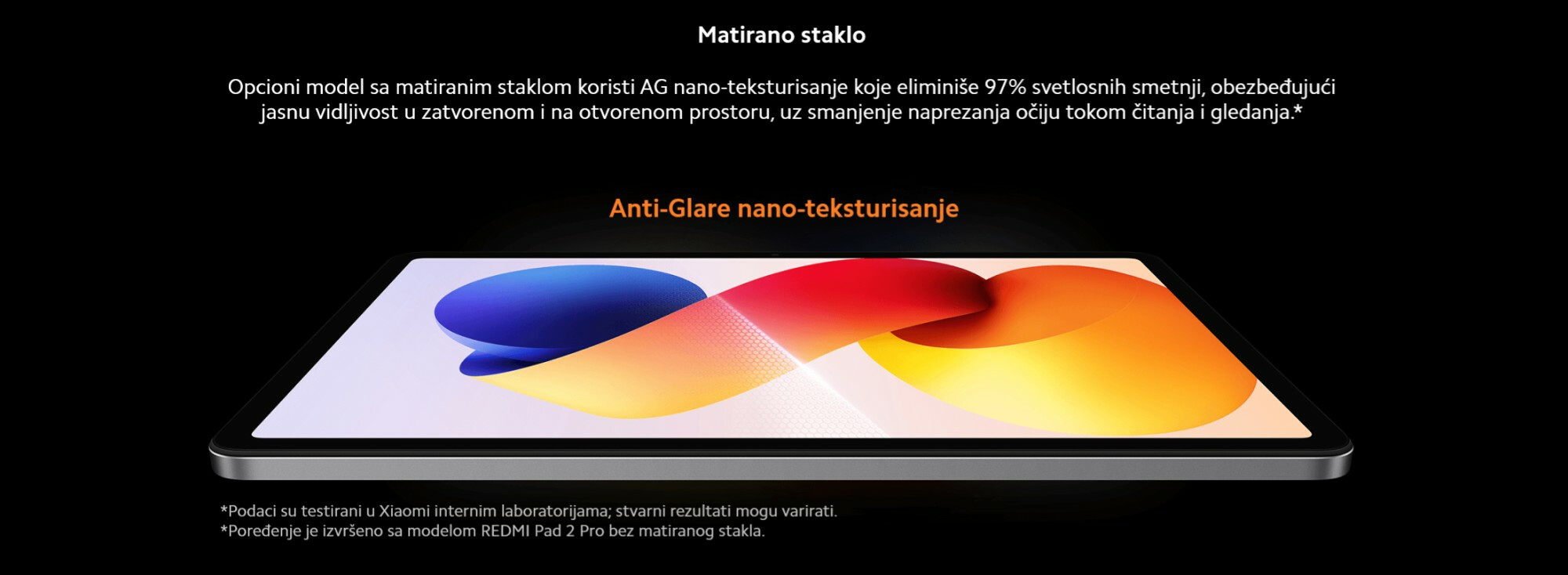 *Podaci testirani u Xiaomi internim laboratorijama – stvarni rezultati mogu varirati. Poređenje sa Redmi Pad 2 Pro bez mat stakla