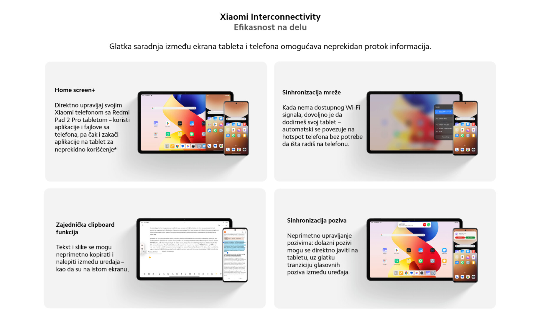*Telefon i tablet moraju biti nadograđeni na Xiaomi HyperOS 2, sa aktiviranim Bluetooth i WLAN podešavanjima, prijavljeni na isti Xiaomi nalog i sa uključenom opcijom „Podešavanja – Xiaomi međupovezanost“. Dostupnost pojedinih funkcija i servisa može varirati u zavisnosti od verzije softvera, aplikacija i modela uređaja – molimo da se oslonite na stvarno korišćenje