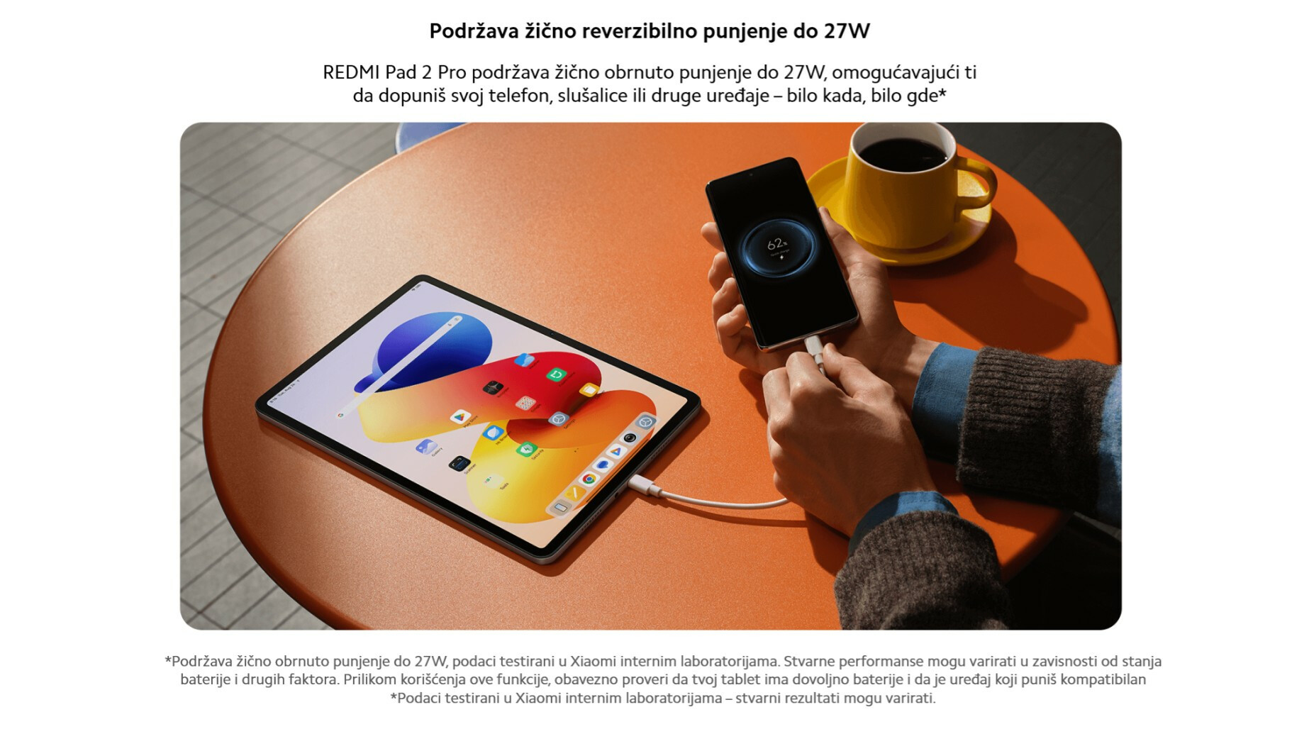 *Podržava žično obrnuto punjenje do 27W, podaci testirani u Xiaomi internim laboratorijama. Stvarne performanse mogu varirati u zavisnosti od stanja baterije i drugih faktora. Prilikom korišćenja ove funkcije, obavezno proveri da tvoj tablet ima dovoljno baterije i da je uređaj koji puniš kompatibilan