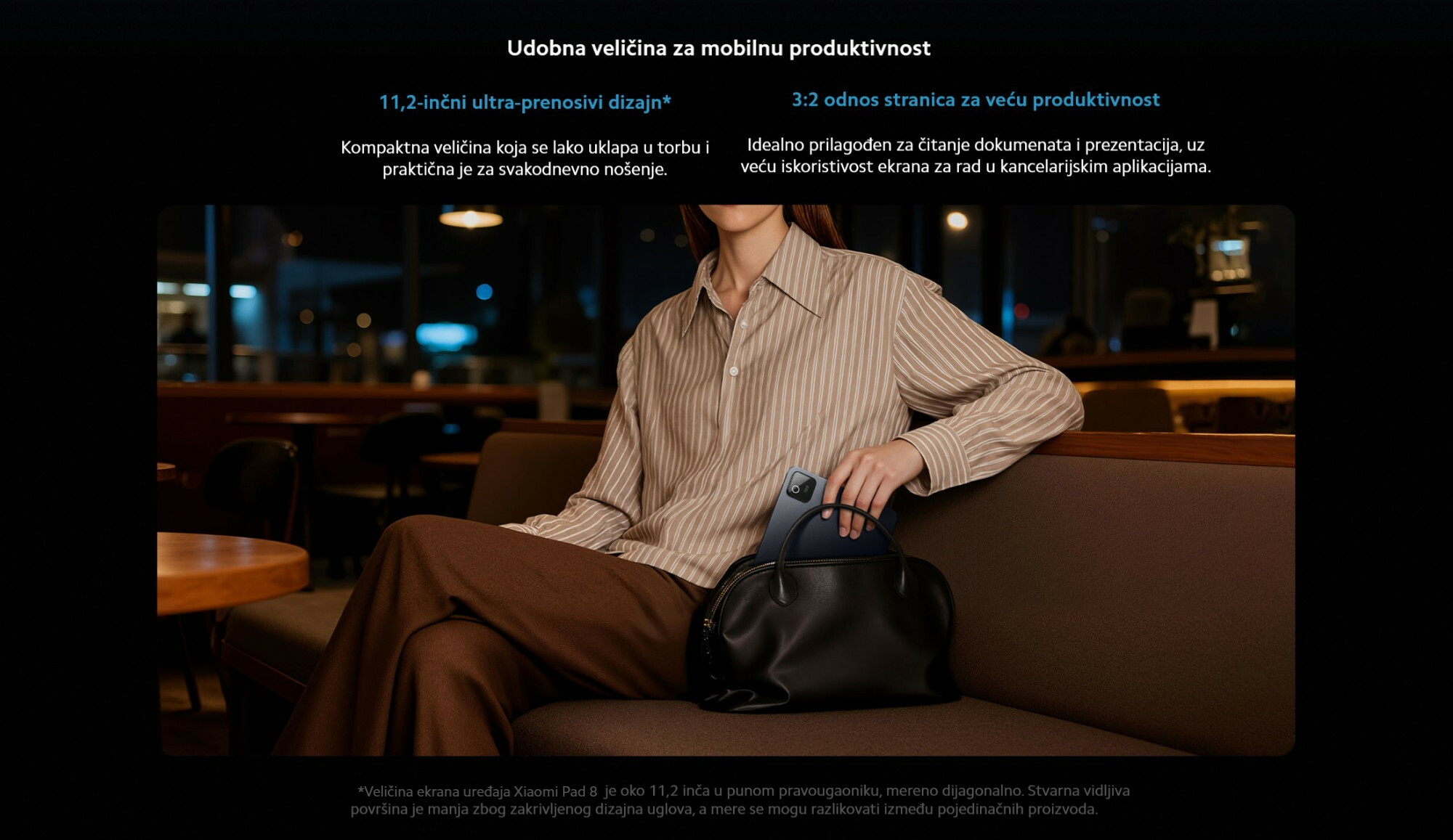 *Veličina ekrana Xiaomi Pad 8 je otprilike 11,2 inča u punom pravougaoniku, mereno dijagonalno. Stvarna vidljiva površina je manja zbog dizajna zaobljenih uglova i mere pojedinačnih proizvoda mogu varirati.