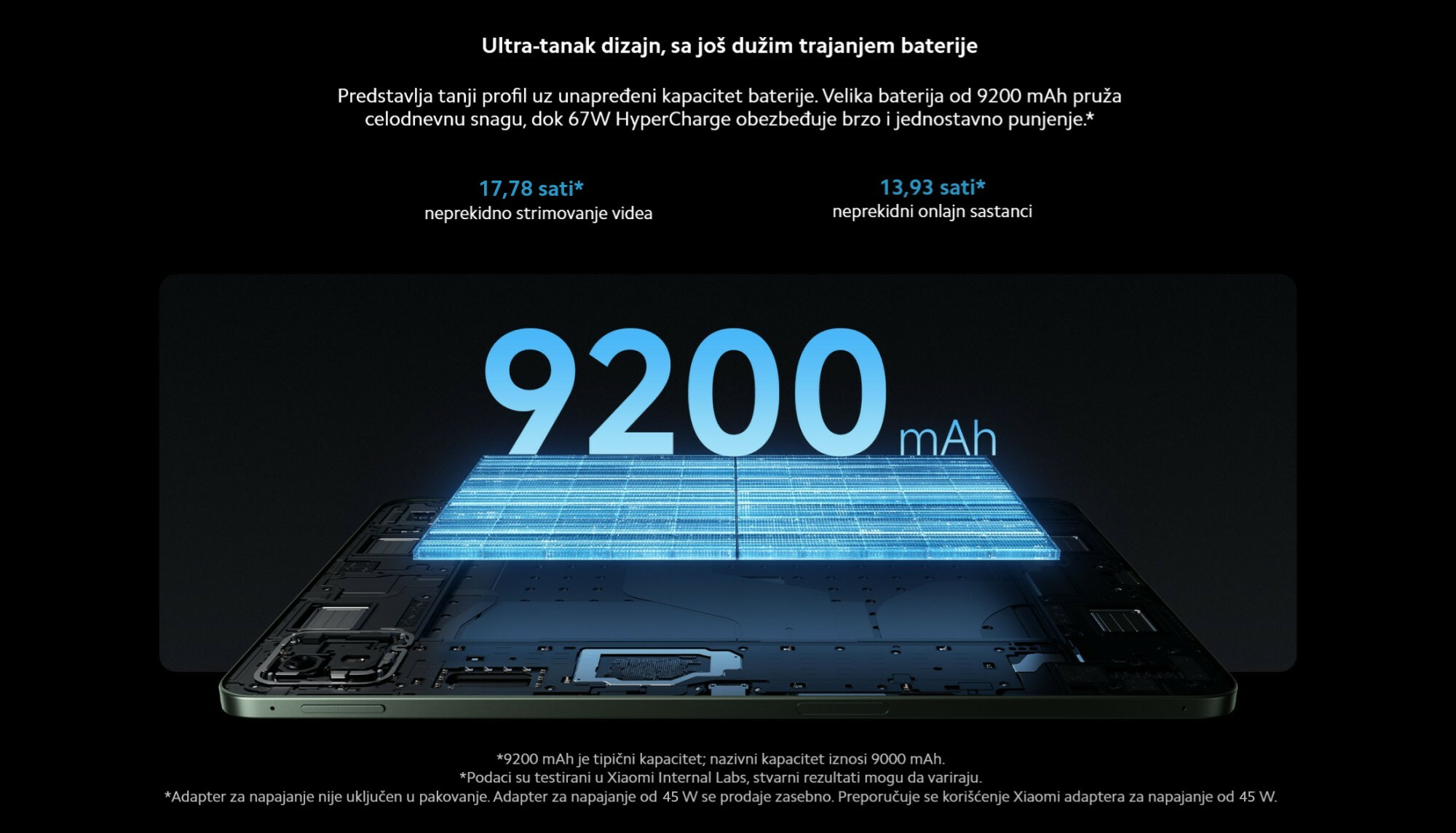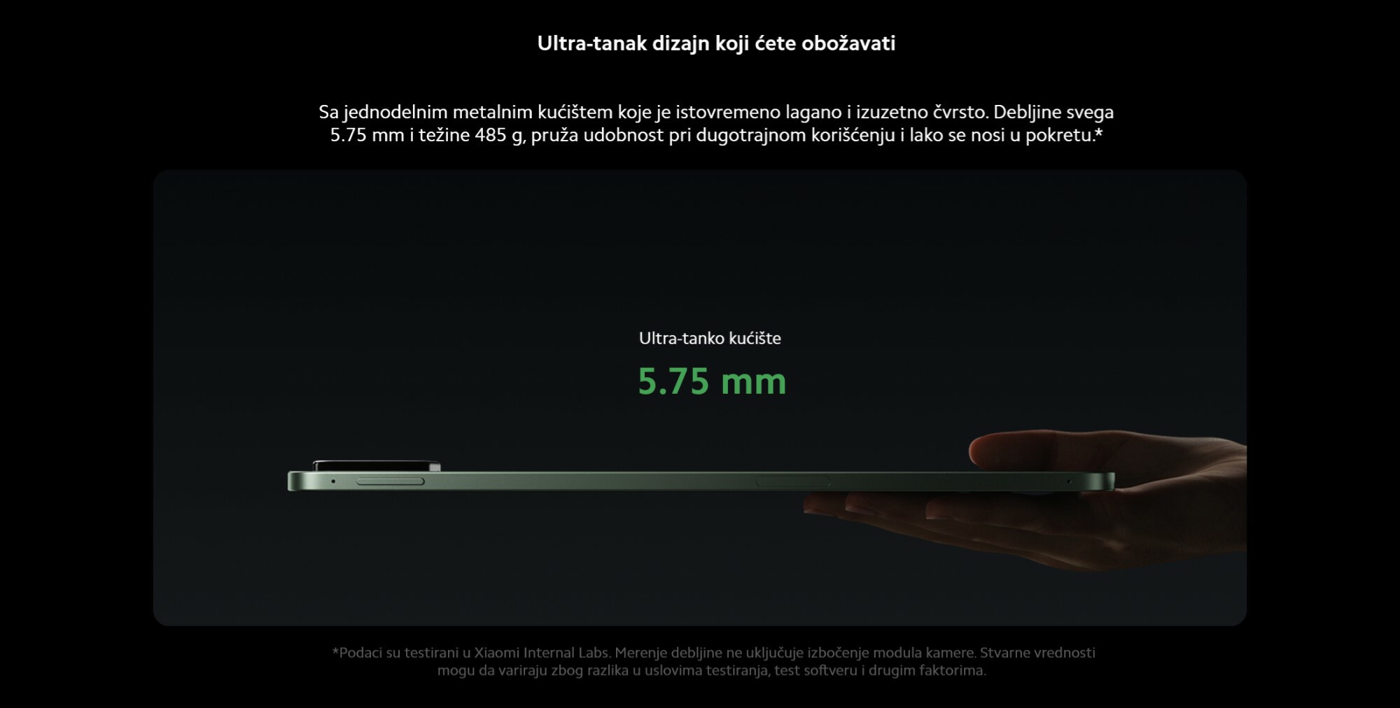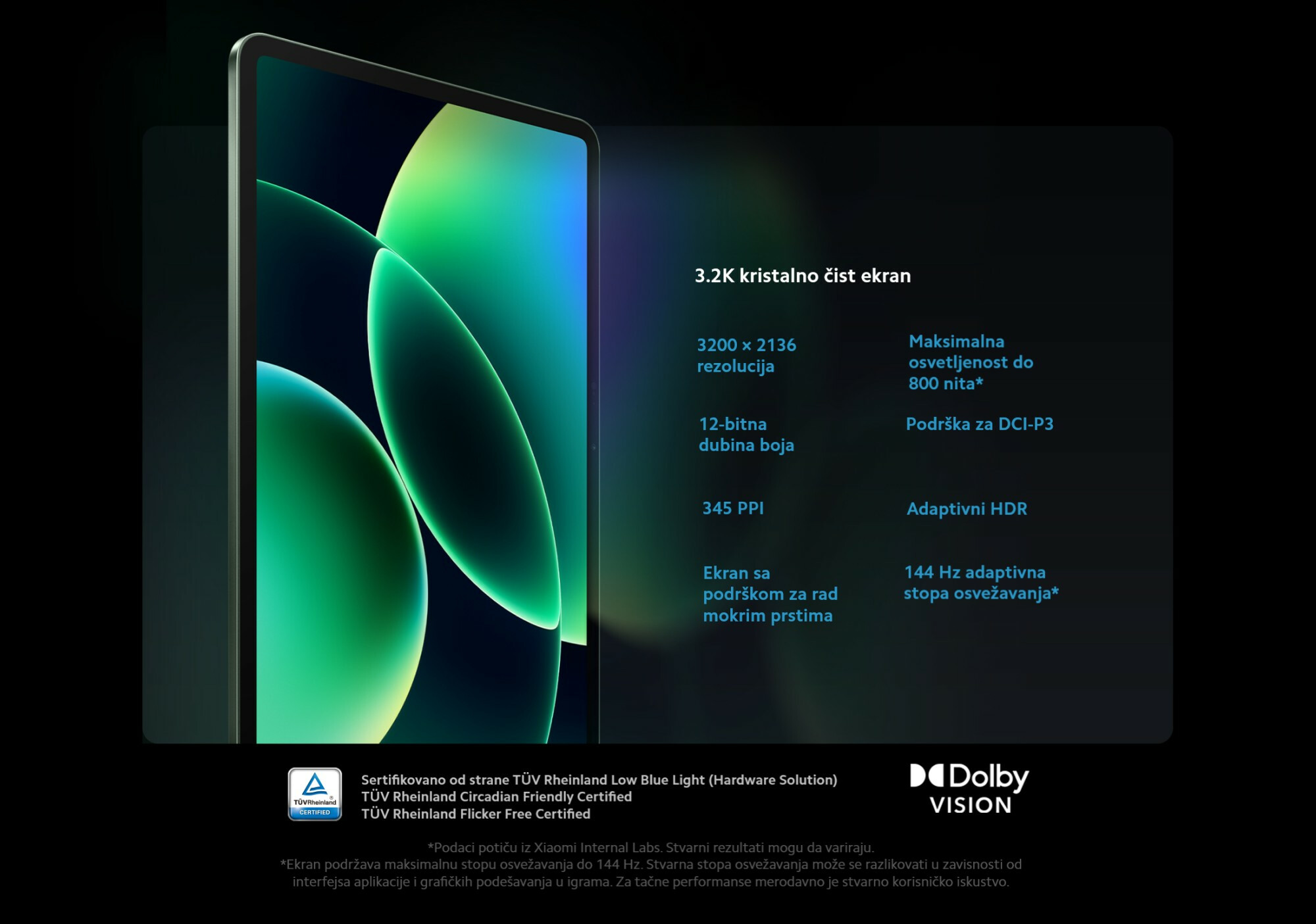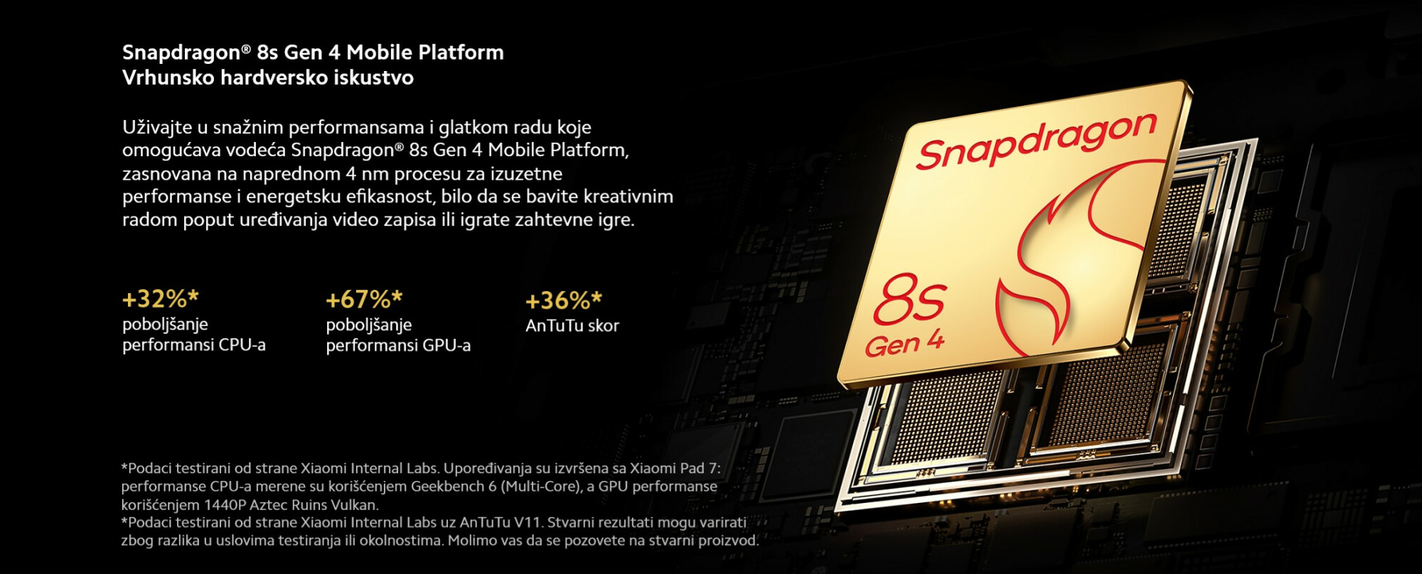 *Podaci testirani od strane Xiaomi Internal Labs. Upoređivanja su izvršena sa Xiaomi Pad 7: performanse CPU-a merene su korišćenjem Geekbench 6 (Multi-Core), a GPU performanse korišćenjem 1440P Aztec Ruins Vulkan.