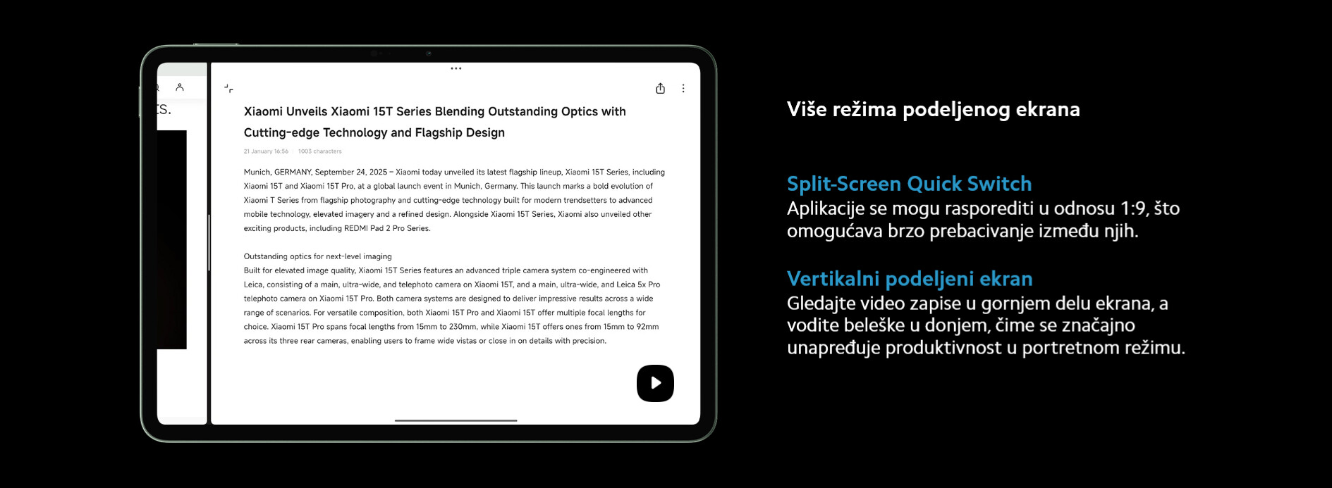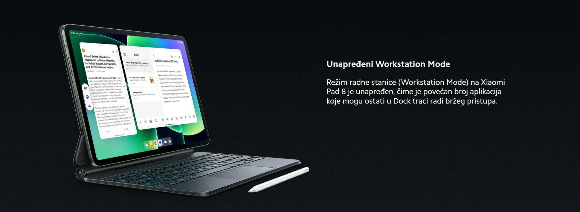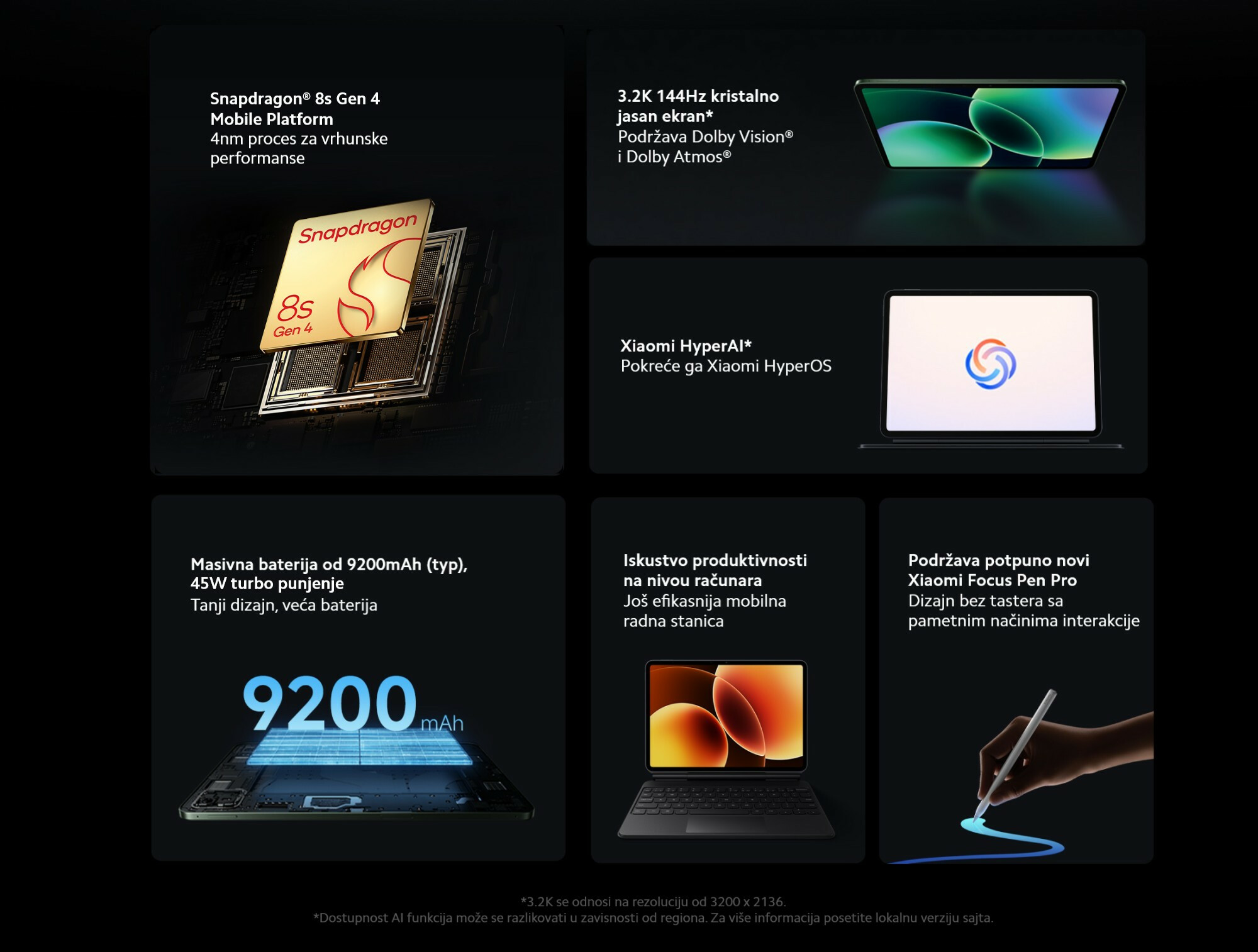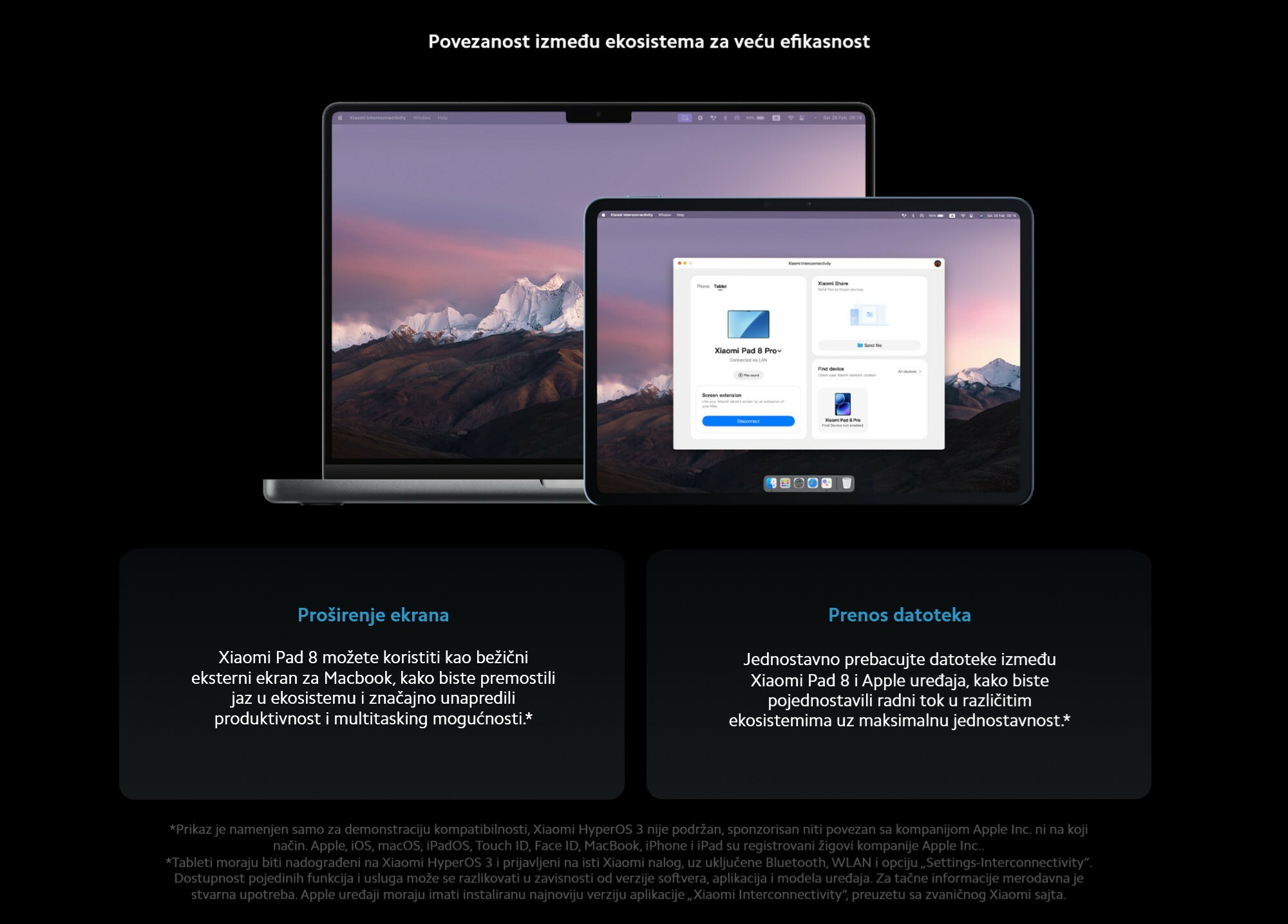 *Tableti moraju biti ažurirani na Xiaomi HyperOS 3 i prijavljeni na isti Xiaomi account, uz omogućen Bluetooth, WLAN i „Settings-Interconnectivity“. Dostupnost određenih funkcija i usluga može varirati u zavisnosti od verzije softvera, aplikacija i modela uređaja, molimo vas da se pozovete na stvarnu upotrebu. Apple uređaji treba da imaju instaliranu najnoviju verziju aplikacije „Xiaomi Interconnectivity“ preuzetu sa zvaničnog Xiaomi veb-sajta.