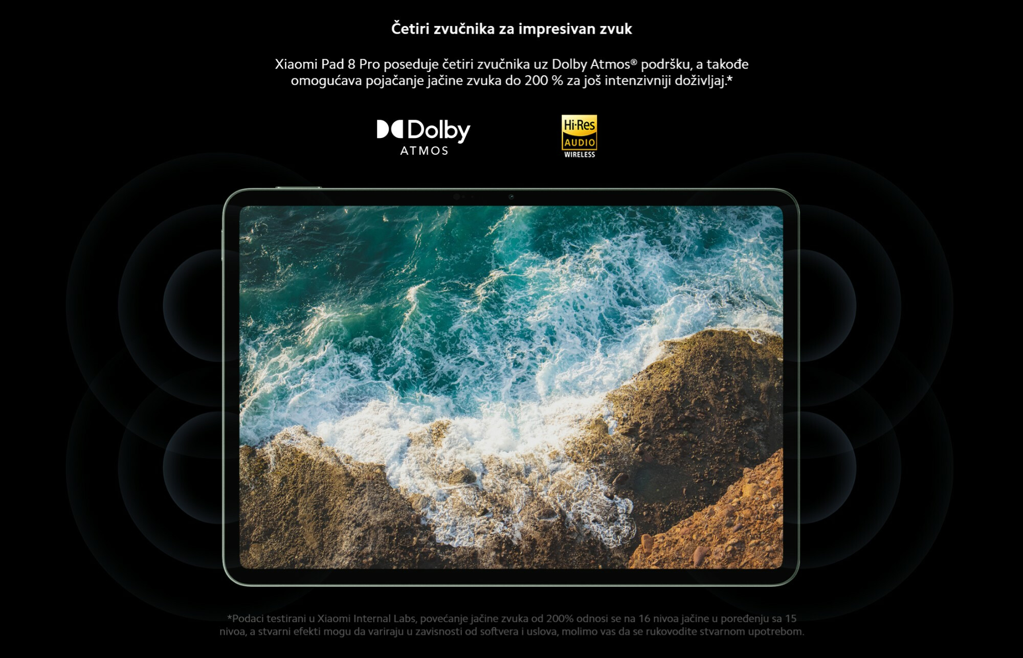 * Podaci testirani u Xiaomi Internal Labs, povećanje jačine zvuka od 200% odnosi se na 16 nivoa jačine u poređenju sa 15 nivoa, a stvarni efekti mogu da variraju u zavisnosti od softvera i uslova, molimo vas da se rukovodite stvarnom upotrebom.